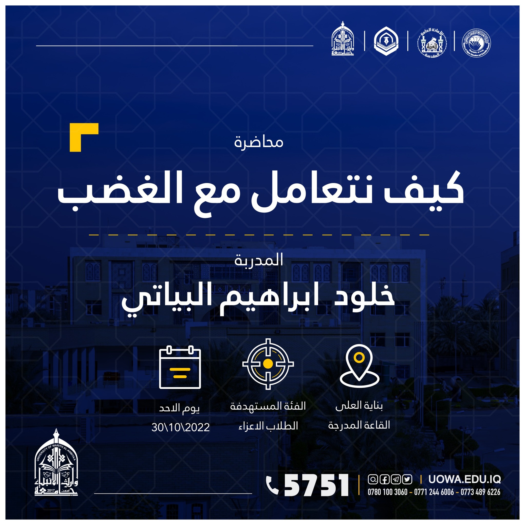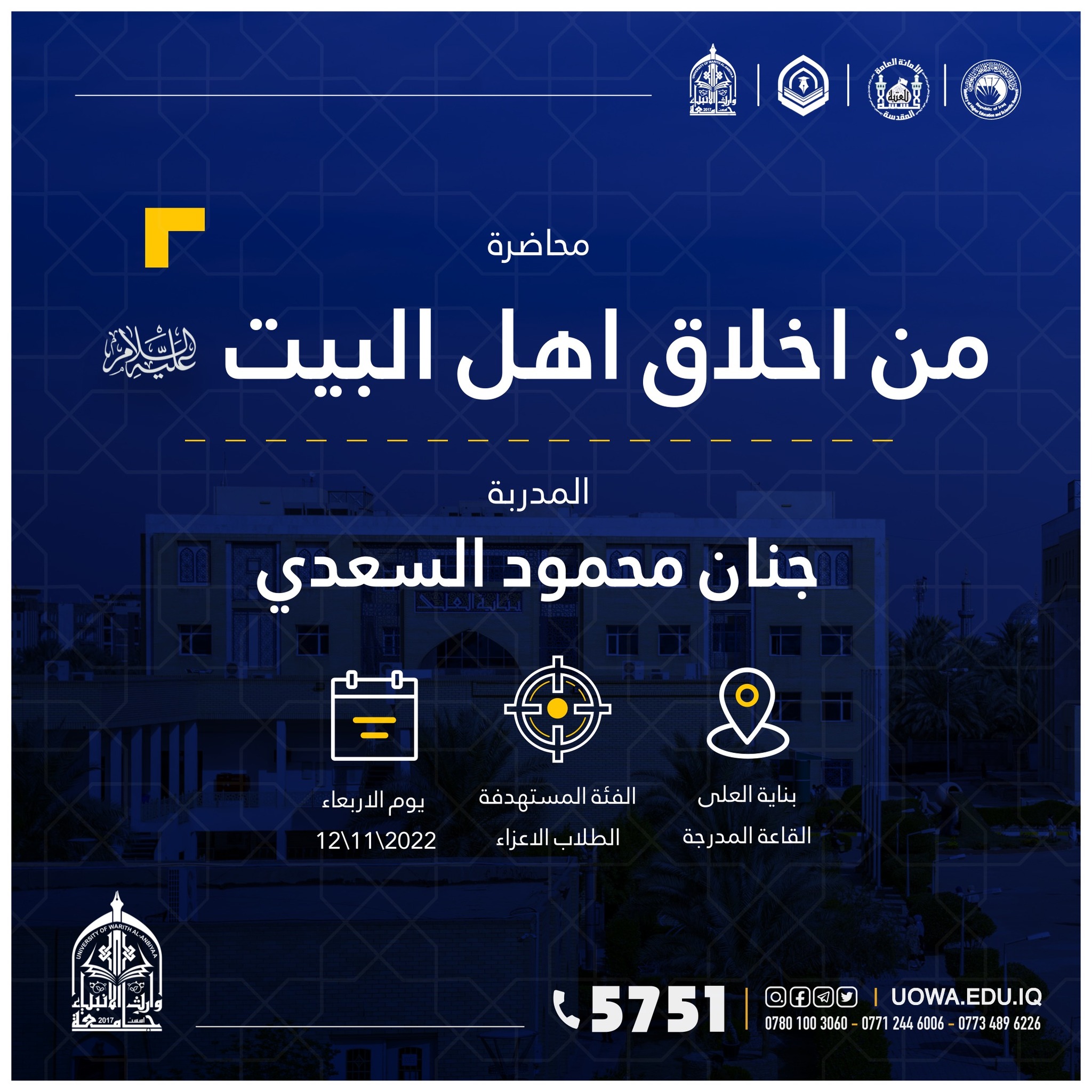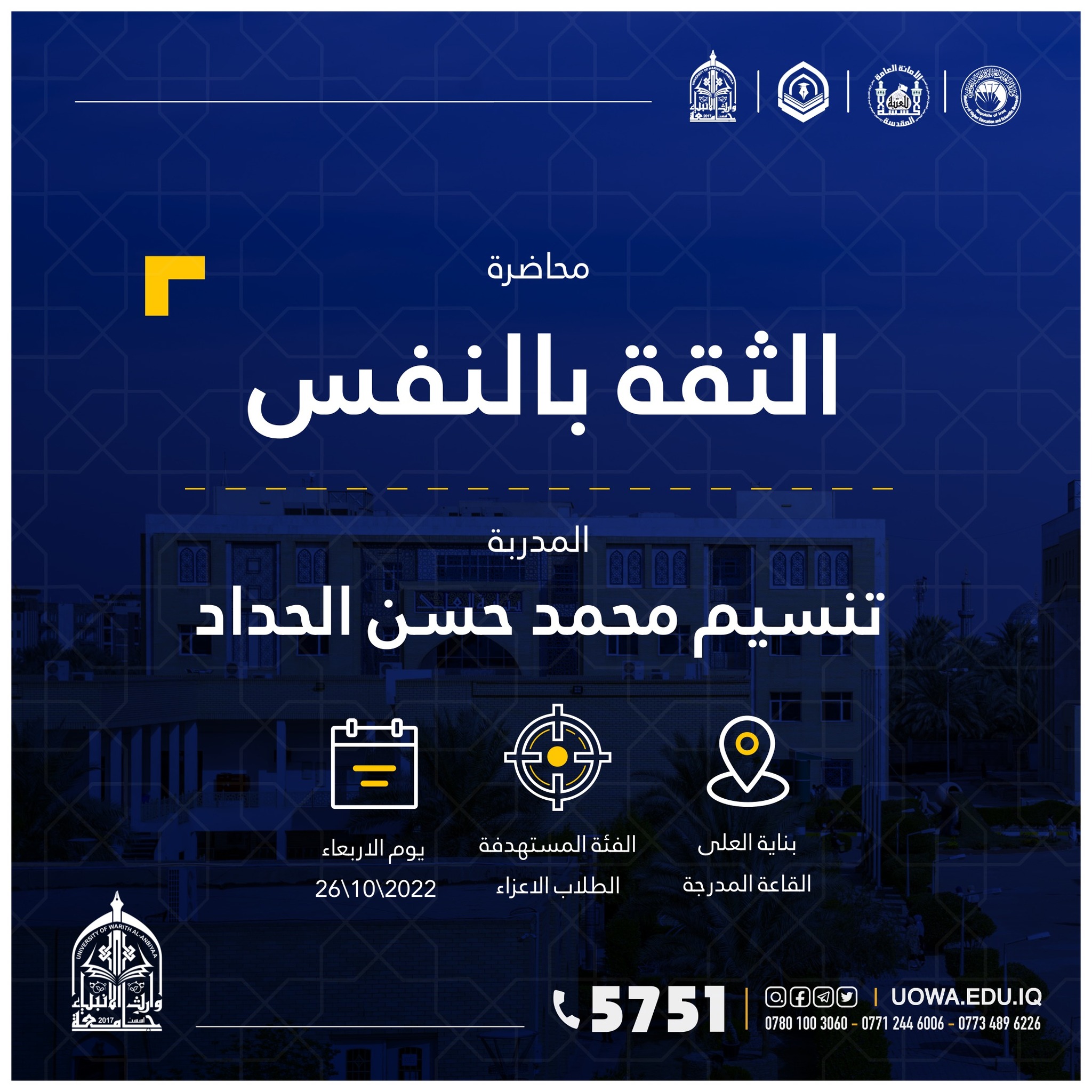 "طلبتنا قادة المستقبل" برنامج تدريبي يطلقه مركز التعليم المستمر في جامعة وارث الانبياء(عليه السلام) لطلبة الجامعة ،ابتداءً من يوم الاحد المصادف 9/10/2022 ،ولمدة تسعة ايام.