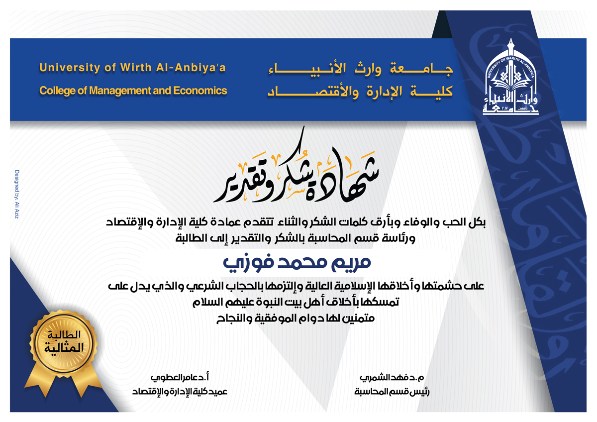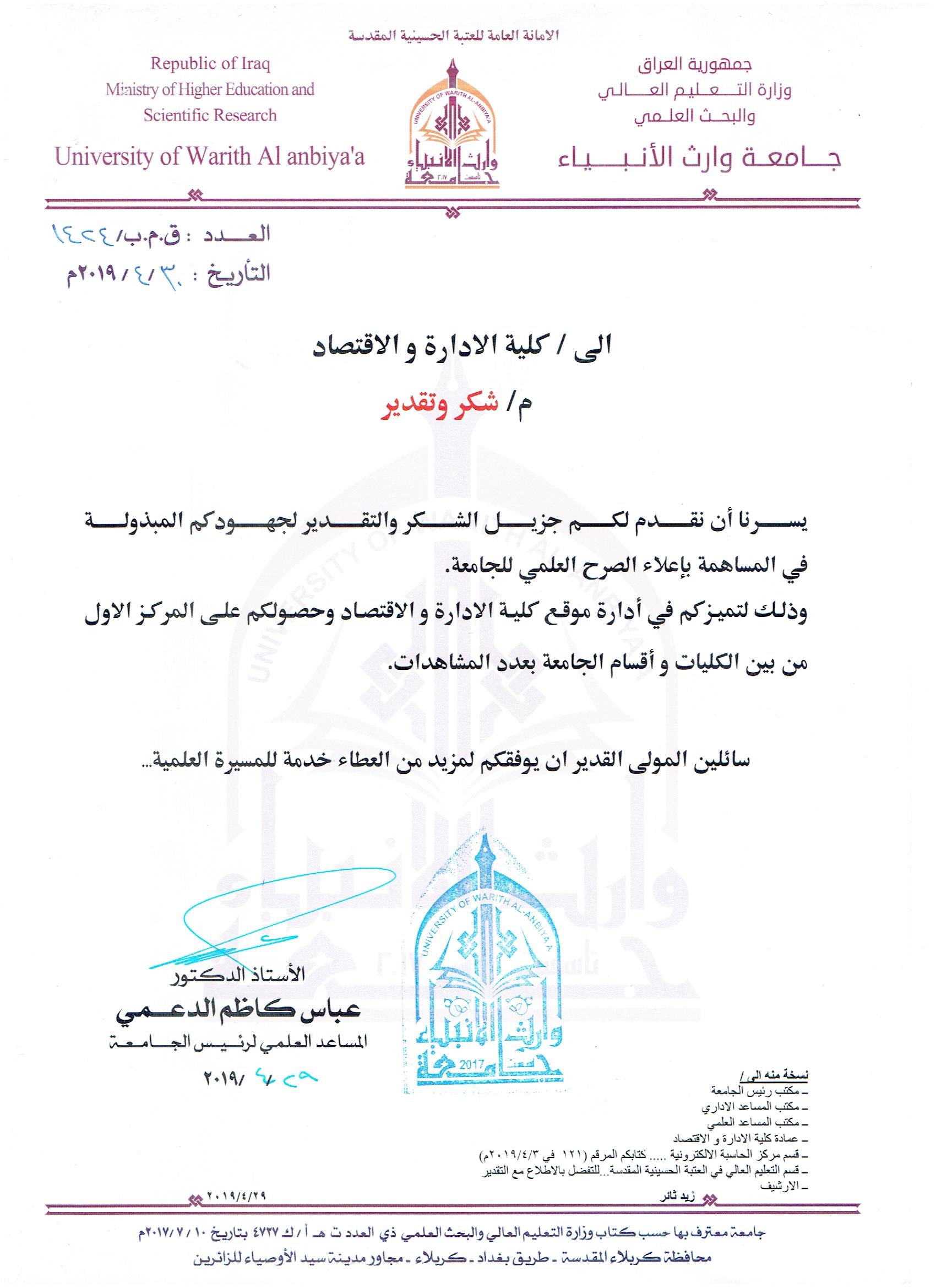 حصلت كلية الادارة والاقتصاد على كتاب شكر وتقدير من قبل أ.د عباس الدعمي  المساعد  العلمي لرئيس جامعة الوارث الانبياء لتحقيق الكلية المركز الاول بين كليات الجامعة في مجال ادارة الموقع الالكتروني