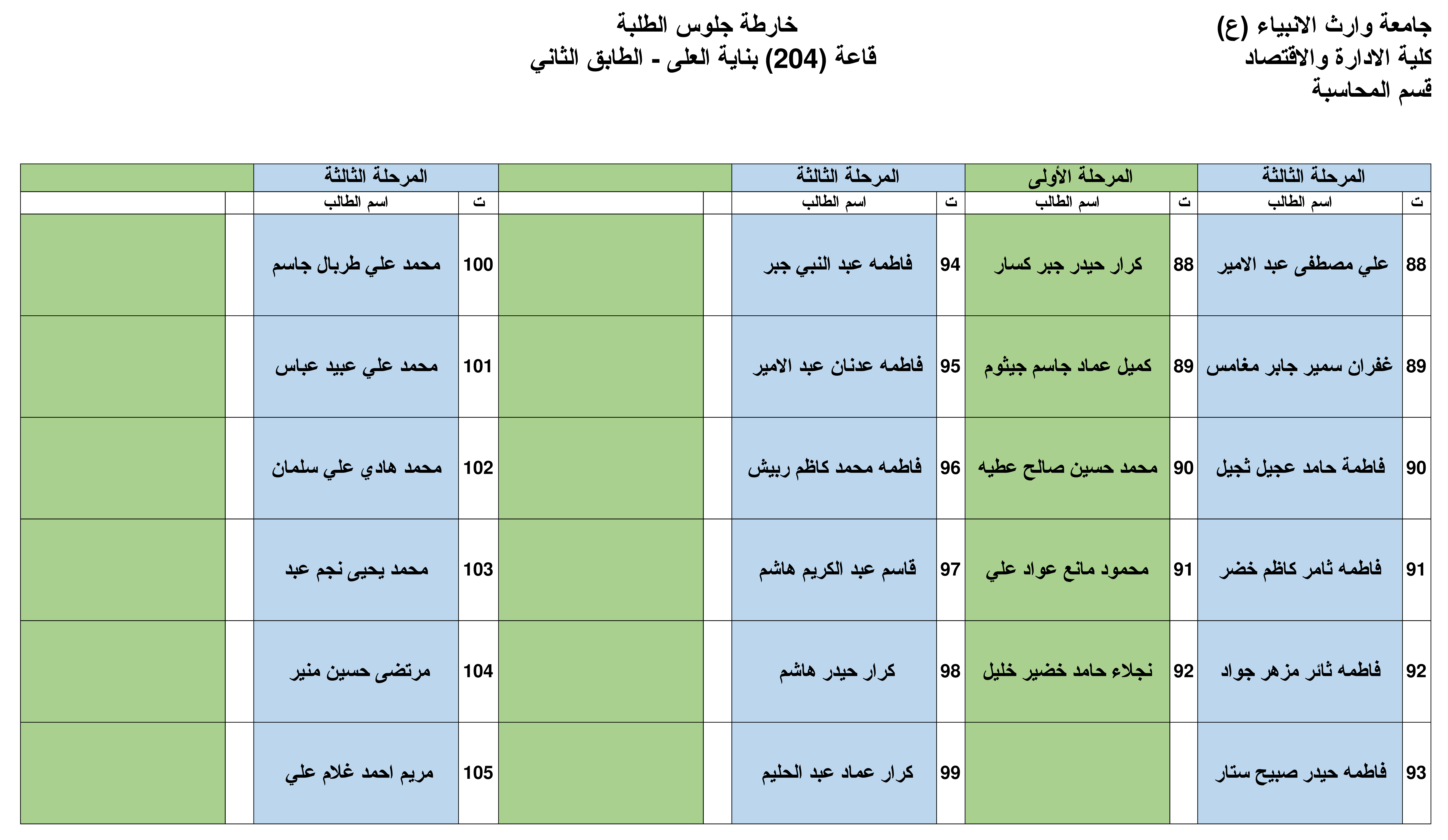 نرفق لكم خارطة الجلوس في القاعات الامتحانية لقسم المحاسبة للمرحلة الأولى والثالثة وكما موضحة في أدناه