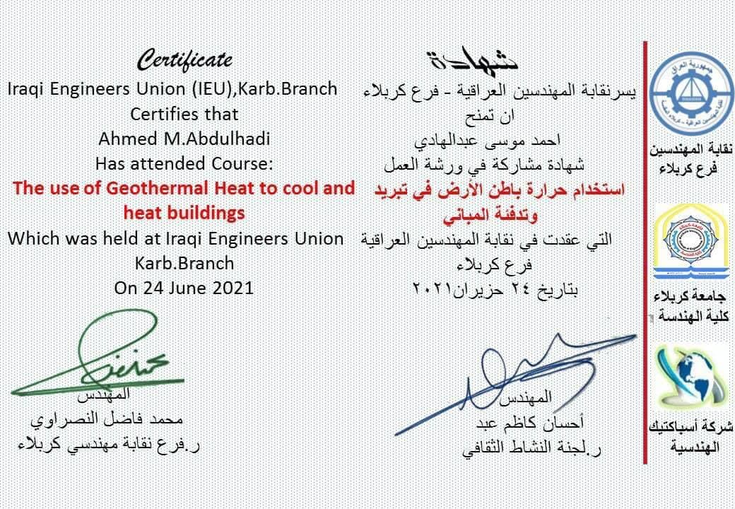 شارك قسم الهندسة المدنية متمثلاً بالتدريسي أ. م. د. احمد موسى عبد الهادي ومقرر القسم م. م. عبد الرسول قنديل في ورشة العمل الموسومة "استخدام حرارة باطن الأرض في تبريد و تدفئة المباني" والتي اقامتها نقابة المهندسين العراقية - فرع كربلاء بالتعاون مع كلية الهندسة في جامعة كربلاء وشركة آسباكتيك الهندسية.