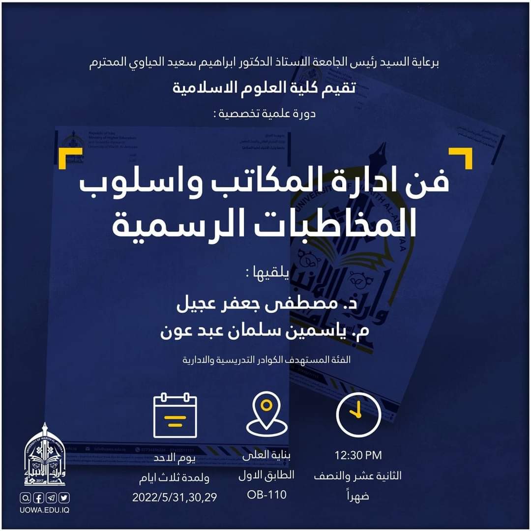 وقد أقامت كلية العلوم الإسلامية منذ بداية العام الدراسي مجموعة من الدورات والورش العلمية حول كيفية كتابة بحوث التخرج لطلبة المرحلة الرابعة.
