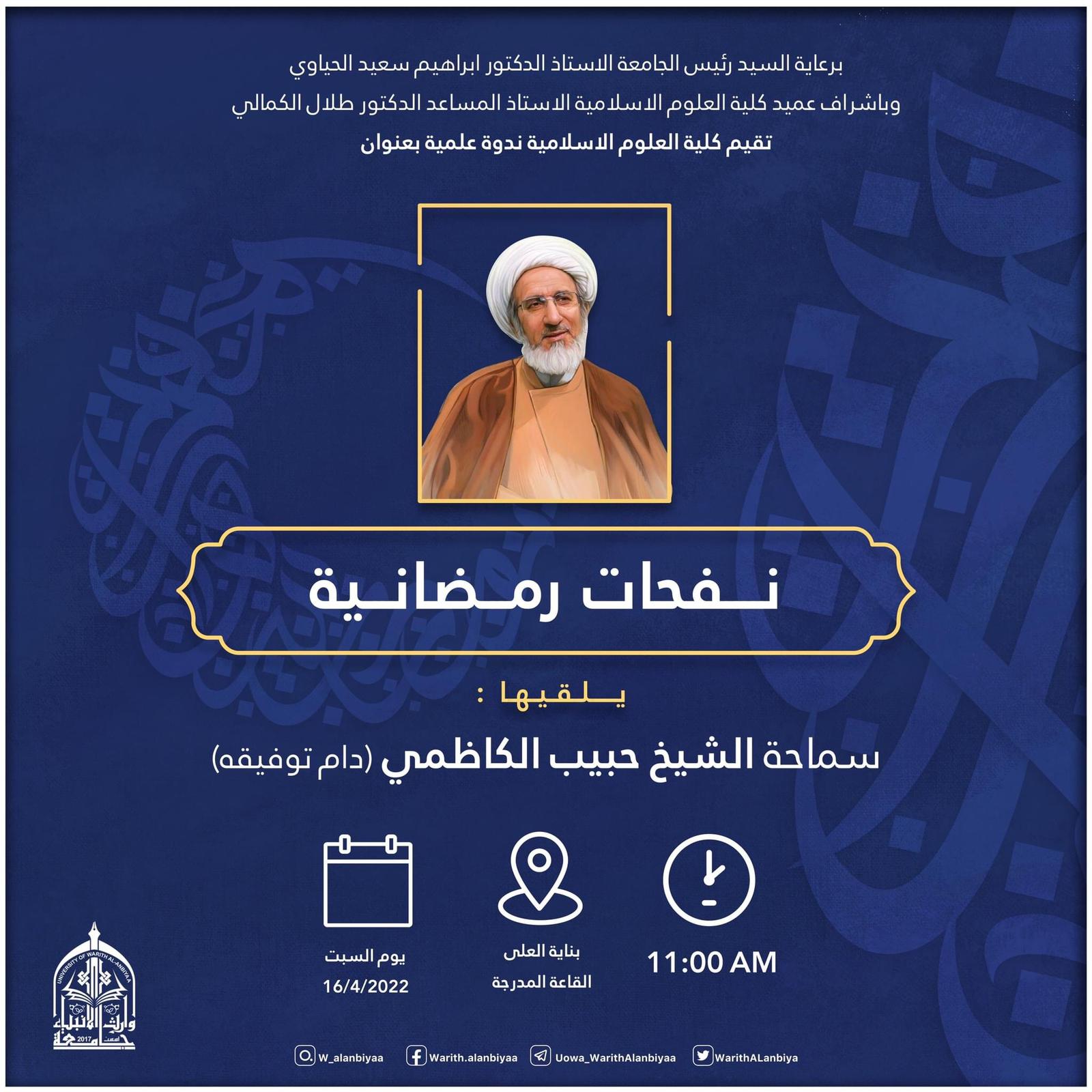 بمناسبة حلول شهر رمضان المبارك ونفحاته تقيم كلية العلوم الإسلامية محاضرة علمية يلقيها سماحة الشيخ ( حبيب الكاظمي) في يوم السبت الموافق ١٦ / ٤ / ٢٠٢٢ على القاعة المدرجة في بناية العلى في تمام الساعة ( ١١) صباحا