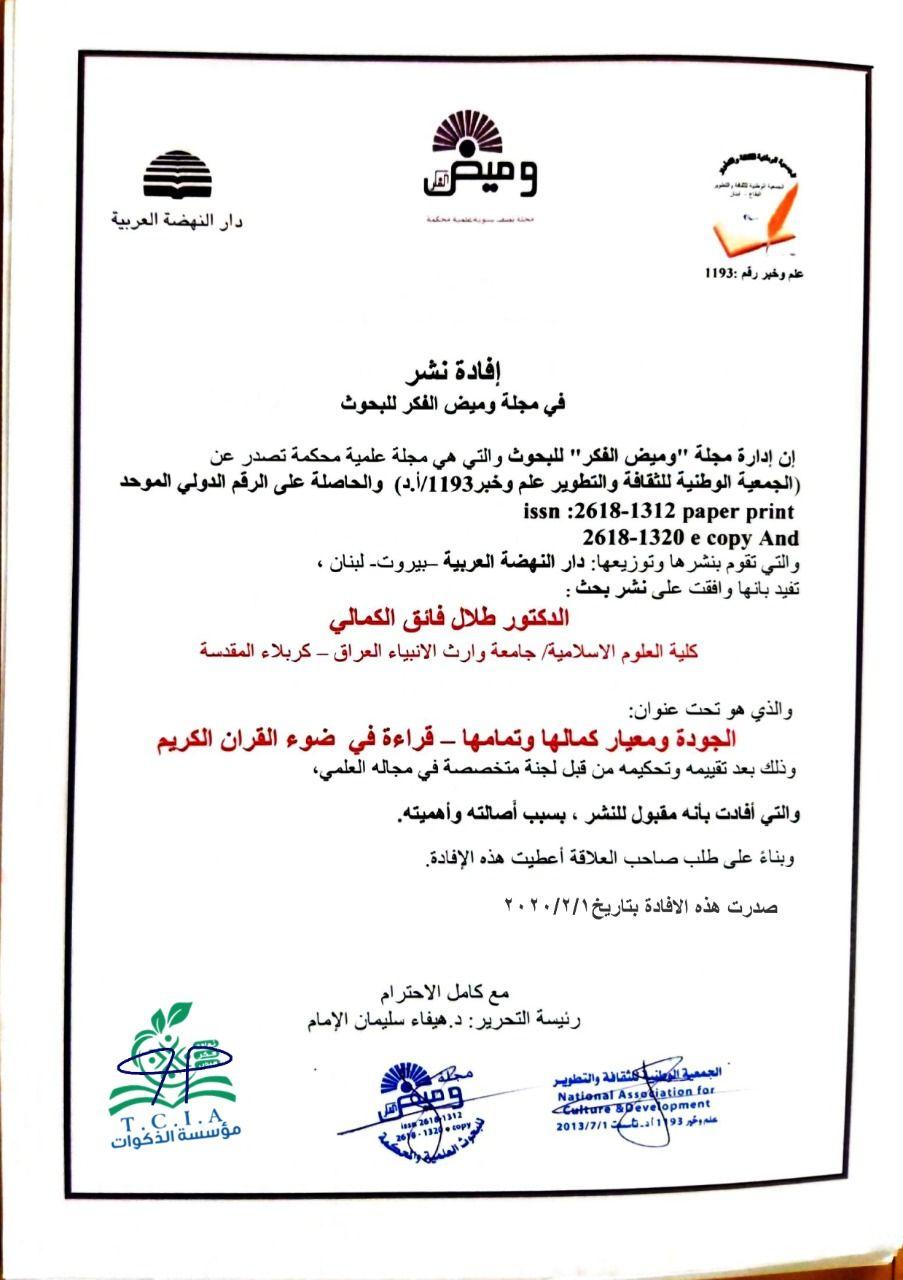 نشر البحث الموسوم بـ ( الجودة ومعيار كمالها وتمامها - قراءة في ضوء القرآن الكريم ) للدكتور طلال فائق الكمالي عميد كلية العلوم الاسلامية / جامعة وارث الانبياء (ع) في مجلة وميض الفكر للبحوث وذلك بعد تقييمه وتحكيمه من قبل لجنة متخصصة في مجال البحث العلمي والتي أفادت بأنه مقبول للنشر بسبب أصالته واهميته .