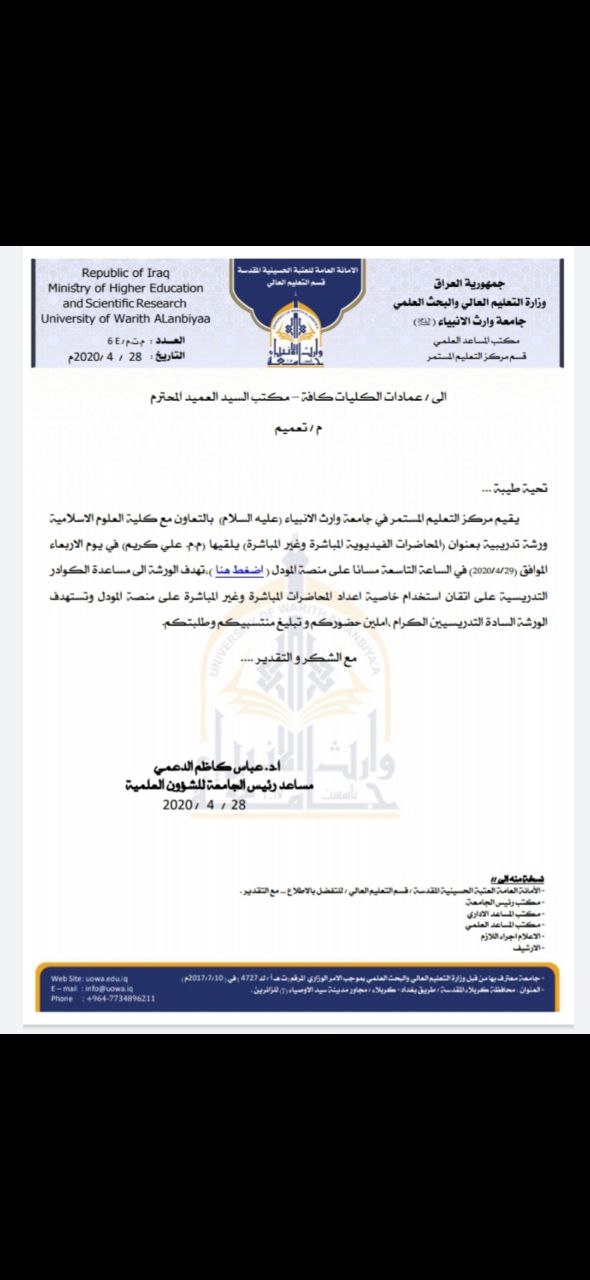 يقيم مركز التعليم المستمر بالتعاون مع كلية العلوم الاسلامية / جامعة وارث الانبياء ورشة تدريبية بعنوان ( المحاضرات الفيديوية المباشرة وغير المباشرة) يلقيها (م.م علي كريم) في يوم الاربعاء الموافق ٢٠٢٠/٤/٢٩ في الساعة التاسعة مساء على منصة المودل تهدف الورشة الى مساعدة الكوادر التدريسية على اتقان استخدام خاصية اعداد المحاضرات المباشرة وغير المباشرة على منصة المودل للطلبة في الوضع الراهن الذي تطلب استمرار التدريس على منصات التعليم الالكتروني