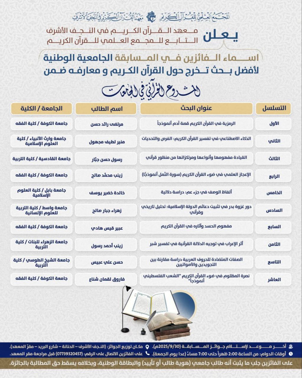"طالب في كلية العلوم الإسلامية بجامعة وارث الأنبياء يحصد المركز الثاني في مسابقة المشروع القرآني في الجامعات"