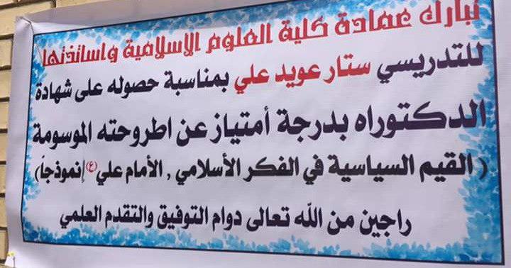 حصل التدريسي في كلية العلوم الاسلامية المدرس المساعد ستار عويد الدلفي على شهادة الدكتوراه بدرجة امتياز عن اطروحته الموسومة ( القيم السياسية في الفكر السياسي ، الامام علي (عليه السلام) انموذجاً ) مبارك للاستاذ راجين المولى دوام التوفيق له في مسيرته العلمية .