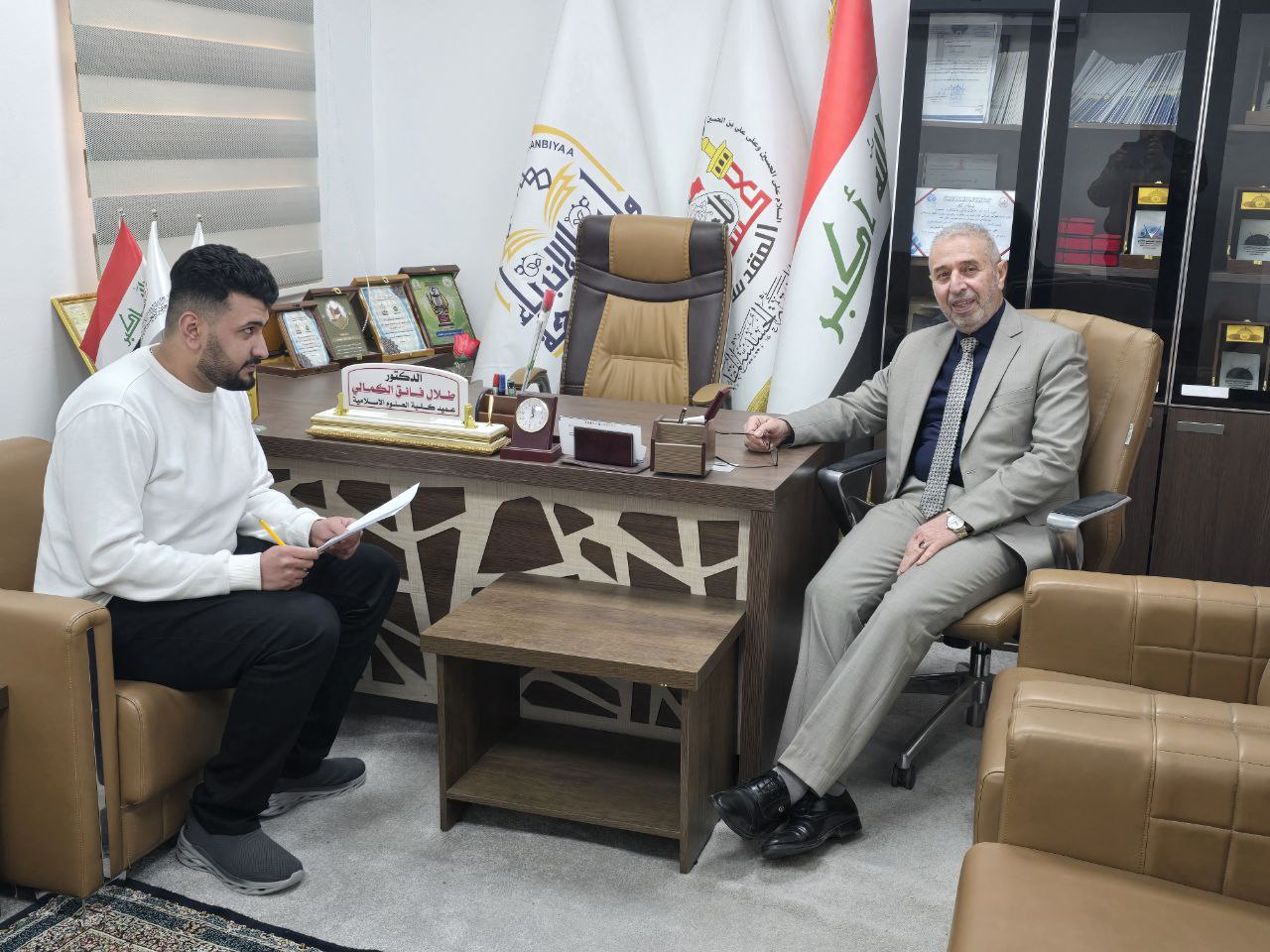 عميد كلية العلوم الإسلامية يلتقي أحد طلاب كلية الإعلام في إطار حرصه على تعزيز التواصل مع الطلبة وتشجيعهم على تحقيق التميز الأكاديمي، التقى الدكتور طلال فائق الكمالي، عميد كلية العلوم الإسلامية في جامعة وارث الأنبياء، أحد طلاب كلية الإعلام يوم الاثنين. خلال اللقاء، دار الحديث حول أهمية التخصصات الأكاديمية في بناء المجتمع، وناقش الدكتور طلال مع الطالب سبل تعزيز التعاون بين الكليات المختلفة داخل الجامعة، مؤكداً على الدور الحيوي الذي يلعبه الإعلام في نقل الصورة الإيجابية ودعم القيم الإنسانية. ويأتي هذا اللقاء ضمن سلسلة من الجهود التي تبذلها عمادة الكلية لتعزيز الحوار والتفاعل بين الطلبة والكادر الأكاديمي في الجامعة.