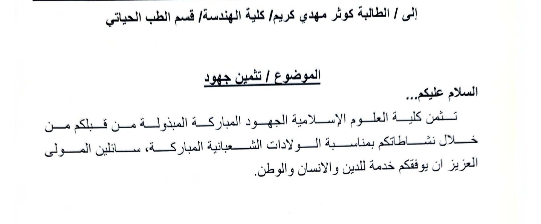 ثمن عميد كلية العلوم الإسلامية، الدكتور طلال الكمالي، الجهود المباركة التي بذلتها الطالبة كوثر مهدي كريم من كلية الهندسة – قسم الطب الحياتي، وذلك من خلال مشاركتها الفاعلة في الأنشطة الخاصة بالولادات الشعبانية المباركة.