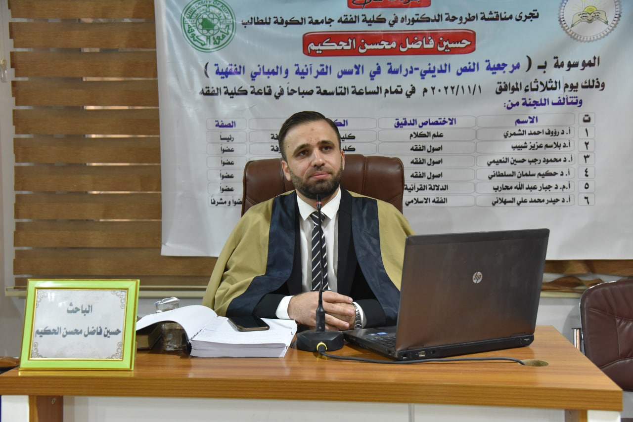 شارك الاستاذ المساعد الدكتور حكيم سلمان السلطاني في عضويه ومناقشة اطروحة الدكتوراه للطالب حسين فاضل محسن الحكيم عن إطروحته الموسومة تحت عنوان : ( مرجعية النص الديني - دراسة في الأسس القرآنية والمباني الفقهية ) وذلك في يوم الثلاثاء الموافق ١/١١/٢٠٢٢ على قاعة مناقشات كلية الفقه جامعة الكوفة