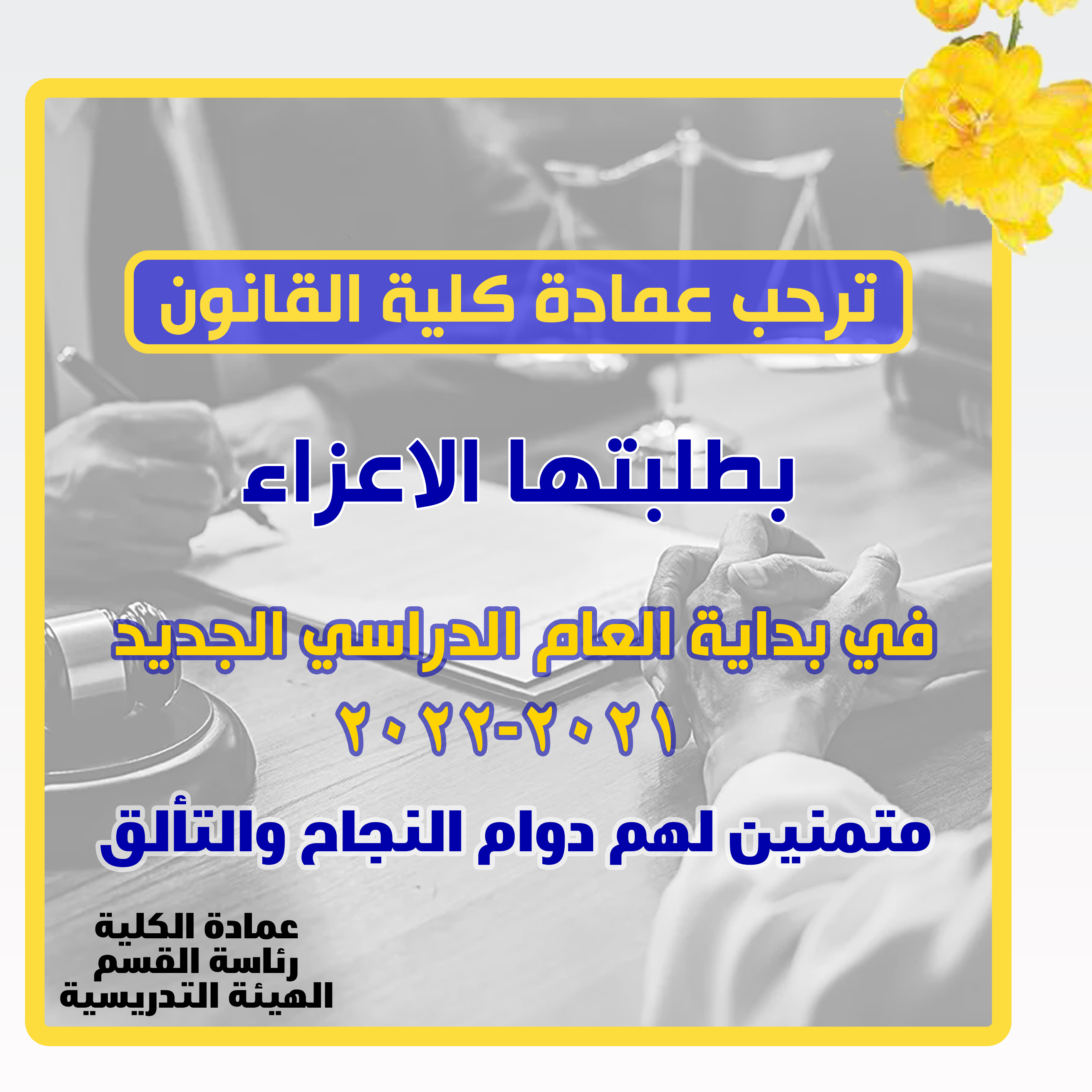 ترحب عمادة كلية القانون بطلبتها الاعزاء بمناسبة بدء العام الدارسي الجديد 2021-2022