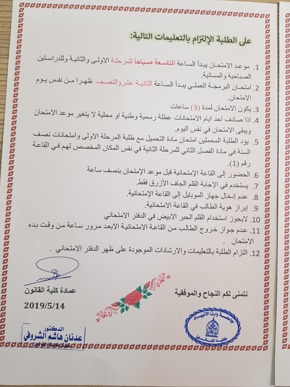 12.        اتباع توجيهات مدير القاعة الامتحانية وعدم جواز مخالفتها والا سيعرض الطالب نفسه للمساءلة القانونية.