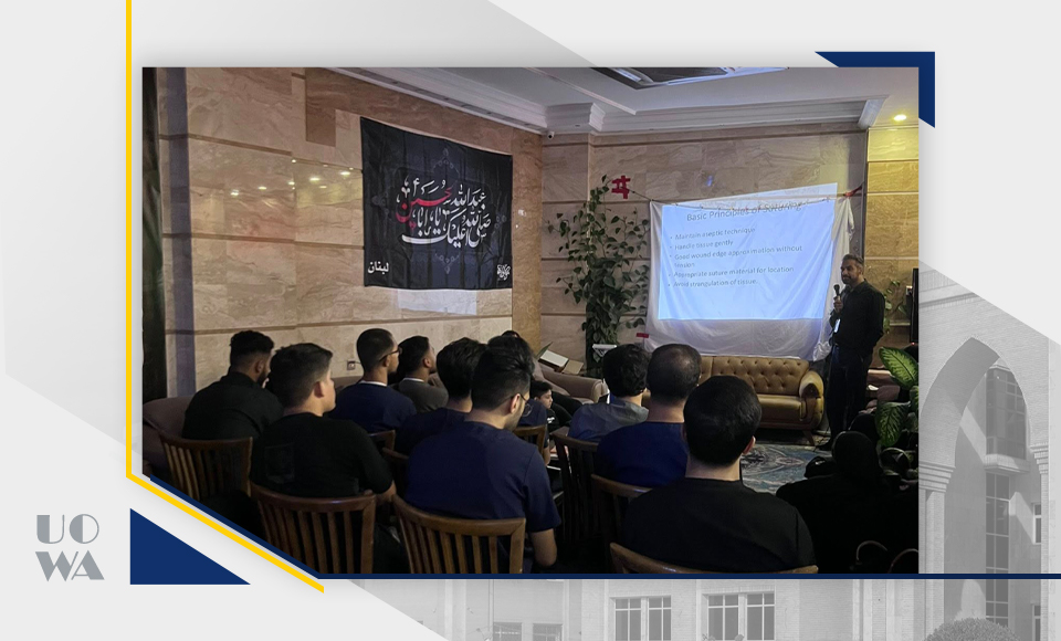 في اجواء العطاء والخدمة و بما يضمن جاهزيتهم لتقديم أفضل الخدمات الطبية في الميدان في زيارة اربعينية الامام الحسين عليه السلام جانب من سلسلة الورش التدريبية لطلبة كلية الطب في جامعة وارث الأنبياء التي نظمتها منظمة الإمامية العالمية IMI ورشة عملية بعنوان Suturing Skills قدّمها الدكتور Mudussar من الولايات المتحدة الأمريكية.