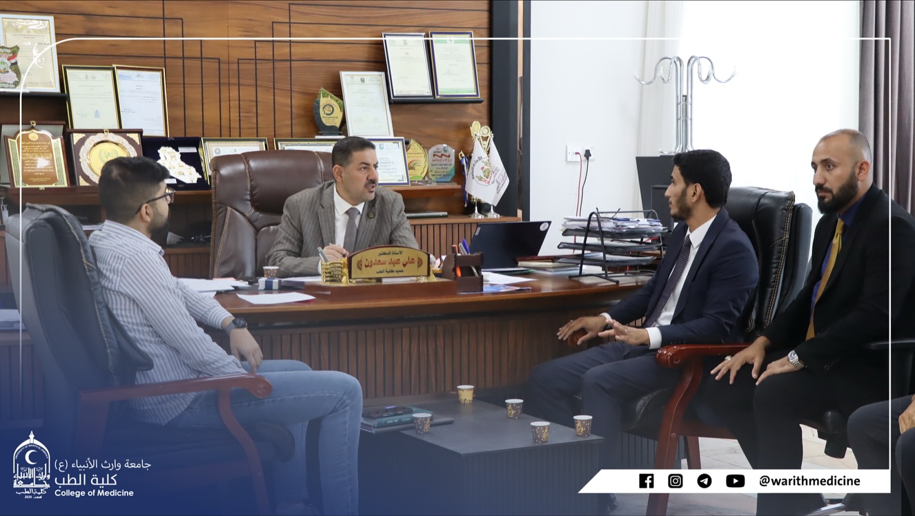 عقد السيد عميد كلية الطب في جامعة وارث الأنبياء (عليه السلام) الاستاذ الدكتور علي عبد سعدون الغزي والسيد معاون العميد للشؤون العلمية الدكتور ليث محمد عباس الحسيني اجتماعًا مع ممثلي طلبة المراحل الدراسية وذلك في إطار حرص العمادة على تعزيز التواصل المباشر مع أبنائها الطلبة والاستماع إلى آرائهم ومقترحاتهم. تضمن الاجتماع مناقشة أبرز القضايا الطلابية والأكاديمية والاستماع إلى ملاحظات الطلبة بشأن العملية التعليمية والبيئة الجامعية والعمل على تذليل الصعوبات بما ينسجم مع رؤية الكلية في توفير بيئة علمية رصينة ومحفزة على التميز.وأكد السيد العميد والسيد المعاون العلمي خلال اللقاء أن أبواب العمادة مفتوحة دائمًا أمام الطلبة وأن الكلية تولي اهتمامًا كبيرًا بصوت الطالب كونه شريكًا فاعلًا في تطوير المسيرة الأكاديمية.