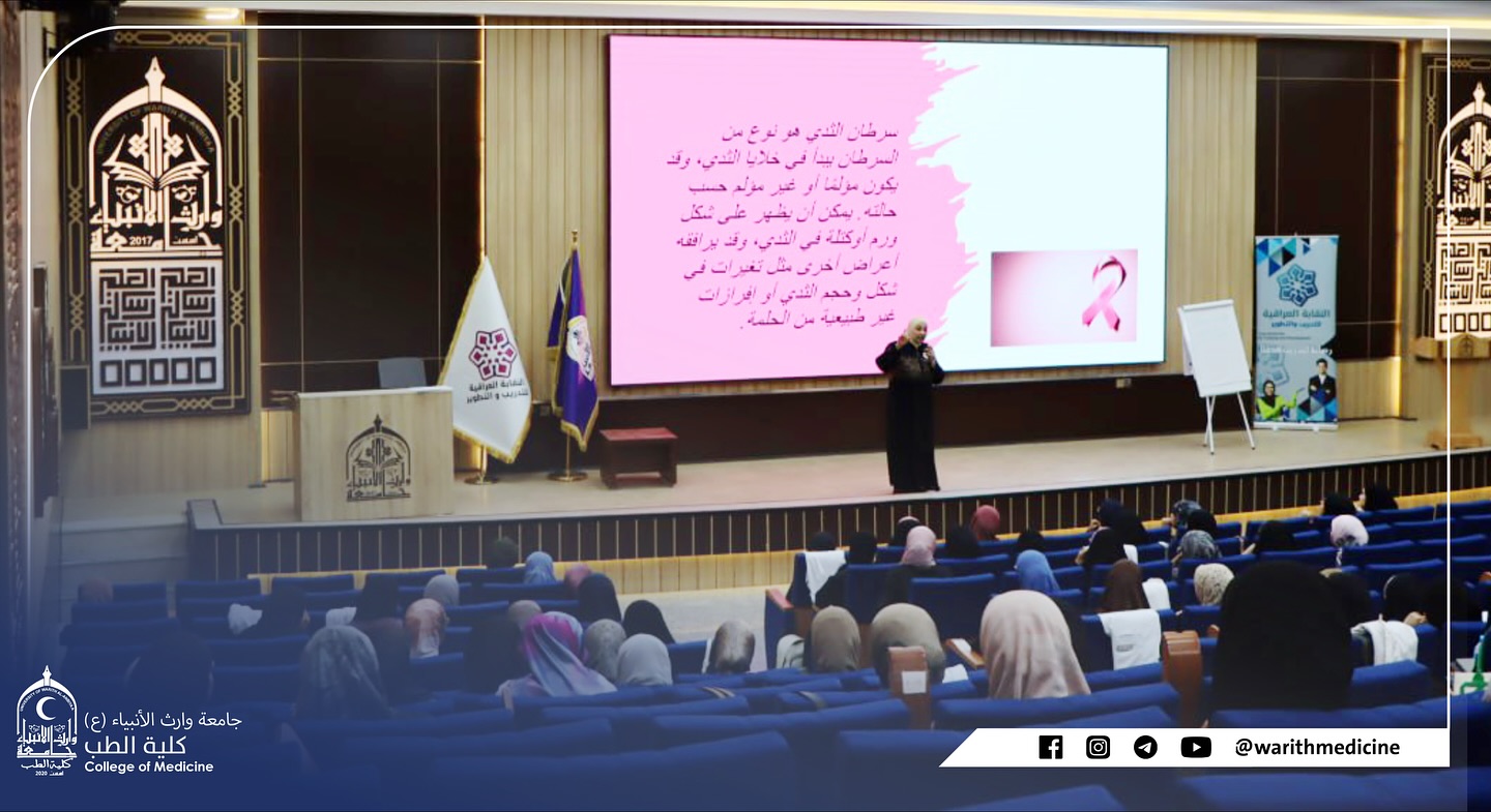 برعاية السيد رئيس جامعة وارث الانبياء عليه السلام الدكتور ابراهيم سعيد الحياوي وبأشراف السيد عميد كلية الطب الأستاذ الدكتور علي عبد سعدون الغزي، أقامت الكلية ندوة توعوية بعنوان “الكشف المبكر عن سرطان الثدي”قدّمتها الدكتورة رغد نعمان طالب / أخصائية نسائية وتوليد وتدريسية في كلية الطب.وتناولت الندوة أهمية الفحص المبكر ودوره في تقليل نسب الإصابة والمضاعفات إضافة إلى طرق الوقاية والعلامات التحذيرية التي تستوجب مراجعة الطبيب المختص.كما أكدت الدكتورة رغد على ضرورة نشر الوعي الصحي بين النساء والفتيات للحد من انتشار هذا المرض وتعزيز فرص الشفاء المبكر.تأتي هذه الندوة ضمن برامج كلية الطب التوعوية المستمرة لتعزيز الصحة العامة ونشر ثقافة الكشف المبكر عن الأمراض.
