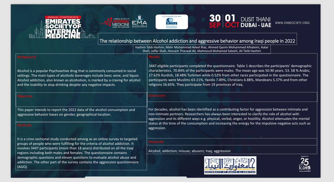 في المؤتمر السنوي لجمعية الطب الباطني الاماراتية في دبي حيث تم قبول واختيار البحث للمشاركة في المؤتمر كبوستر من بين مئات البحوث المقدمة للجان المقيمة.