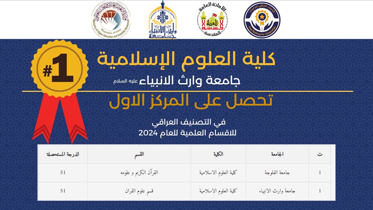 وقد حصل قسم علوم القرآن في كلية العلوم الإسلامية بجامعة وارث الأنبياء على المرتبة الأولى في التصنيف الوطني للأقسام العلمية. جاء هذا الإنجاز نتيجة حرص القسم على تطبيق معايير الجودة والاعتماد البرامجي.