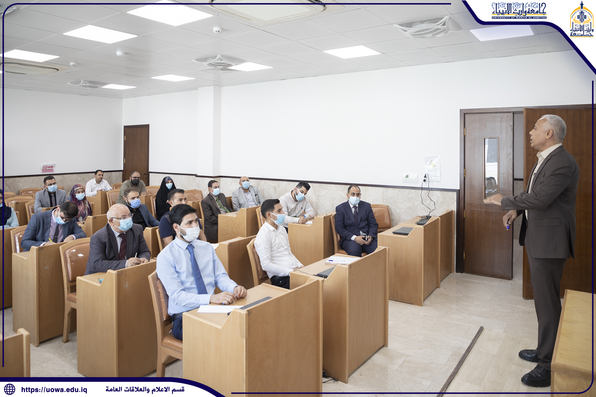 ضمن سعي الجامعة في تطوير كوادرها في جميع العلوم والمهارات اقام قسم التعليم المستمر في جامعة وارث الانبياء (عليه السلام) بالتعاون مع كلية القانون دورة بعنوان (أخطاء تحرير المخاطبات وما يقع فيه الكاتب من عثرات الاملاء) القاها الدكتور (لطيف نجاح القصاب) المتخصص في اللغة العربية وعلى مدى يومان( السبت والاحد) الموافق(29،30/5/2021). تضمن اليوم الاول من الدورة القواعد النظرية للكتابة الصحيحة على مستوى النحو والرسم واليوم الثاني تضمن تطبيقات عملية لتجاوز الأخطاء الشائعة على المستوى الكتابي ، خلال ذلك شارك الحاضرون في كتابة بعض من مفردات اللغة العربية على السبورة و التي تكون موضع اشتباه عند الكثيرين في كتابتها او تلفظها، وجرى توضيحها من قبل الدكتور وما يتبع ذلك من امور هامه يجب ملاحظتها اثناء تحرير الخطابات اللغوية.