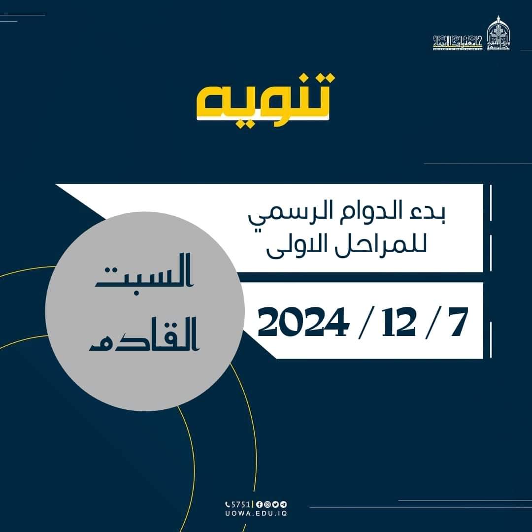 تعلن جامعة وارث الأنبياء عليه السلام عن بدء الدوام الرسمي للمراحل الاولى اعتبارا من يوم السبت القادم الموافق 2024/12/7م تمنياتنا لطلبتنا الاعزاء بأن يكون عاما حافل بالابداع والتألق في المسيرة العلمية والتعليمية.