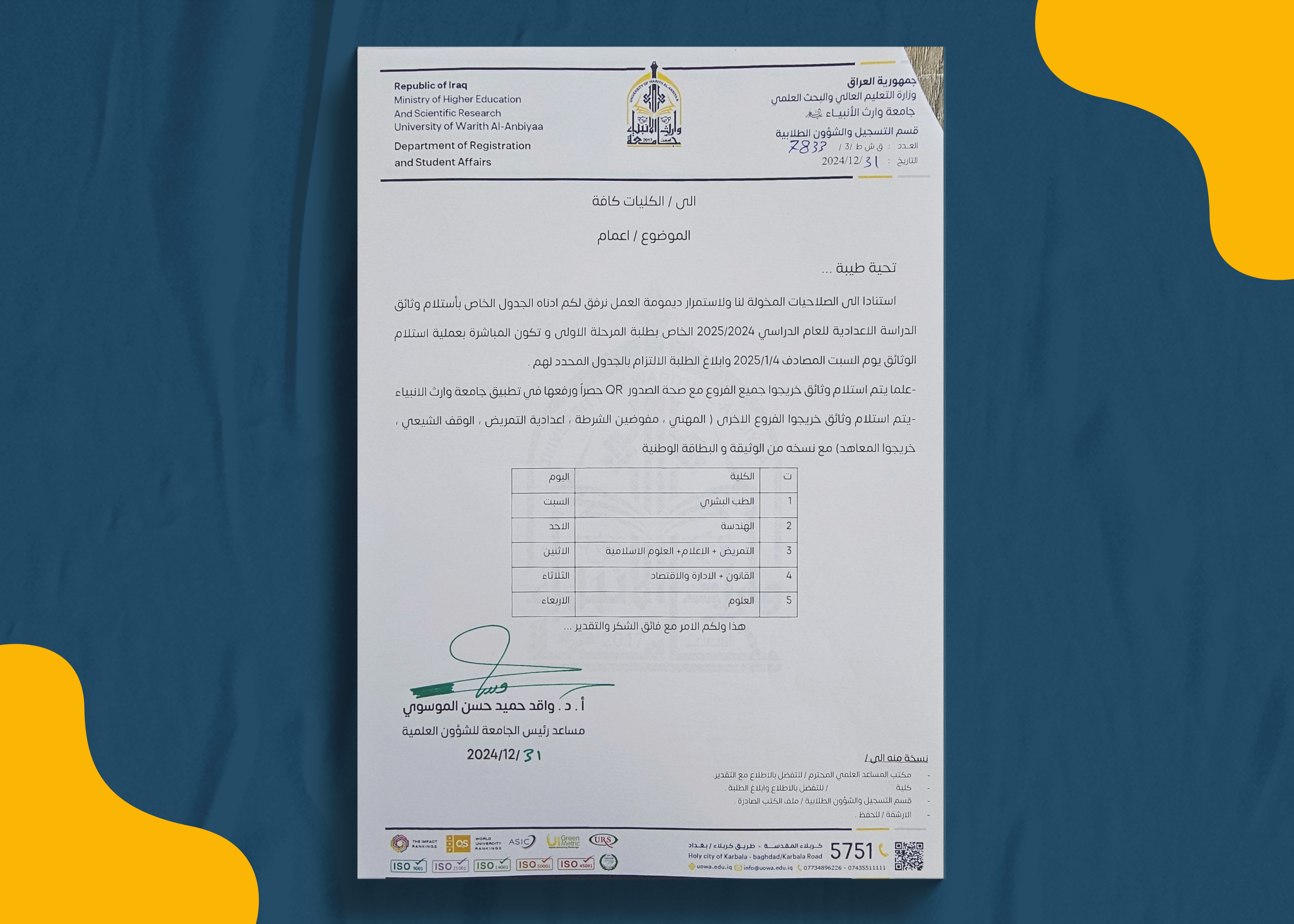 نرجو من طلبتنا الأعزاء الالتزام بالتعليمات والمواعيد المحددة لهم وفق الجدول الخاص بالكليات، مع ضرورة رفع الوثائق عبر تطبيق جامعة وارث الأنبياء.