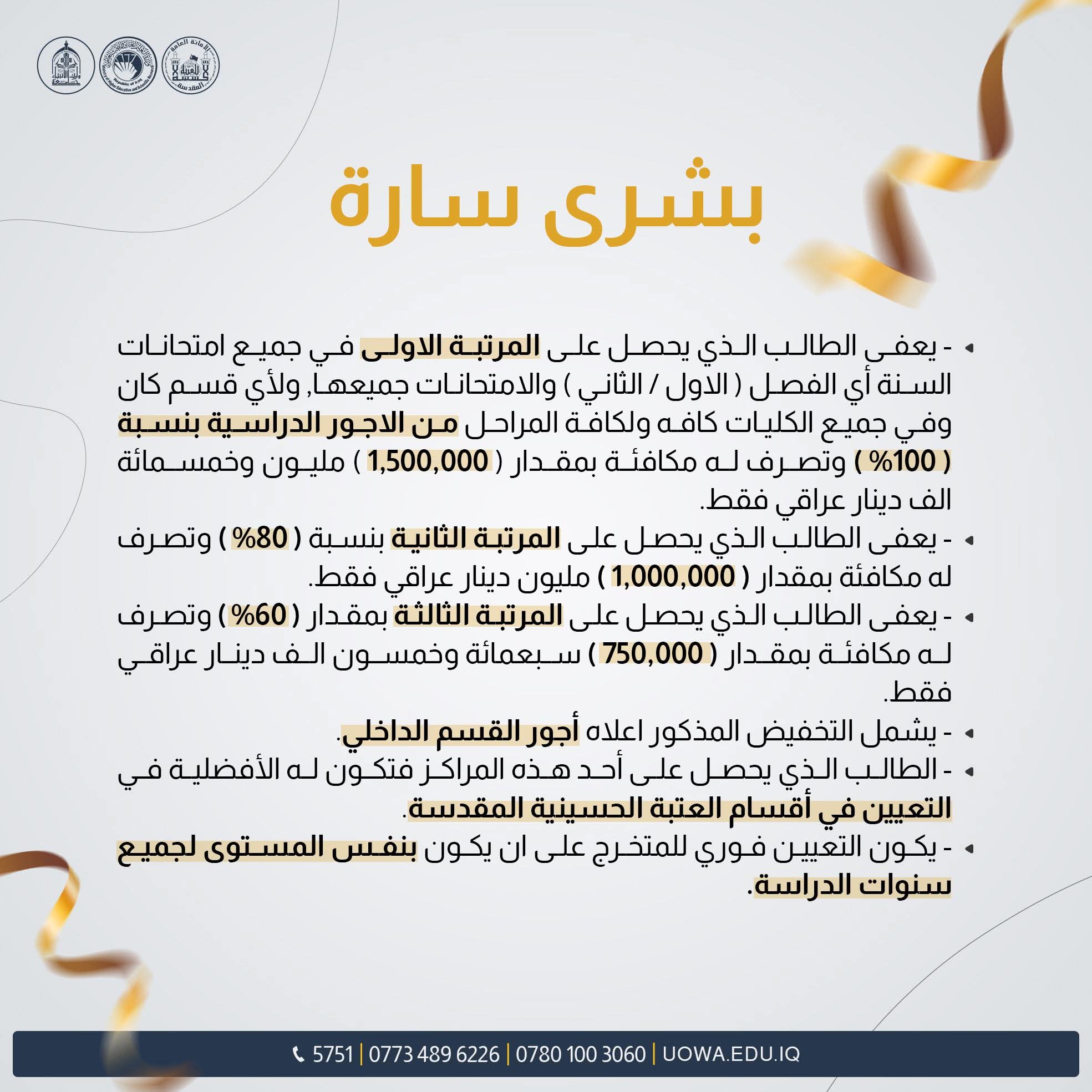 المرتبة الأولى: يُعفى الطالب الذي يحصل على المرتبة الأولى في جميع امتحانات السنة (الفصل الأول والثاني) بنسبة 100% من الأجور الدراسية، بالإضافة إلى منحه مكافأة مالية مقدارها 1,500,000 مليون وخمسمائة ألف دينار عراقي.