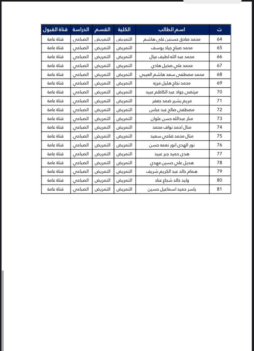 اسماء الطلبة المقبولين في كلية التمريض