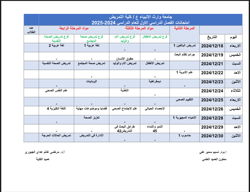 جدول امتحانات الفصل الدراسي الاول للعام 2024-2025  للمرحلة الثانية والثالثة والرابعة