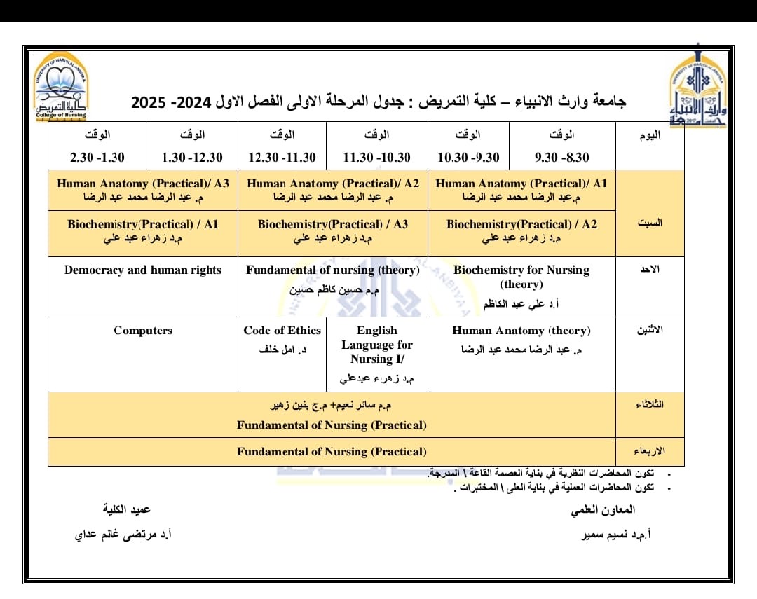 باشراف عمادة كليه التمريض المتمثله بالاستاذ الدكتور مرتضى غانم الجبوري واساتذة مادة اسياسيات التمريض تم اجراء امتحان المد الثاني في المركز الوطني لتقييم الكفايات الطبية (OSCI) لطلبة المرحلة الاولى في كلية التمريض