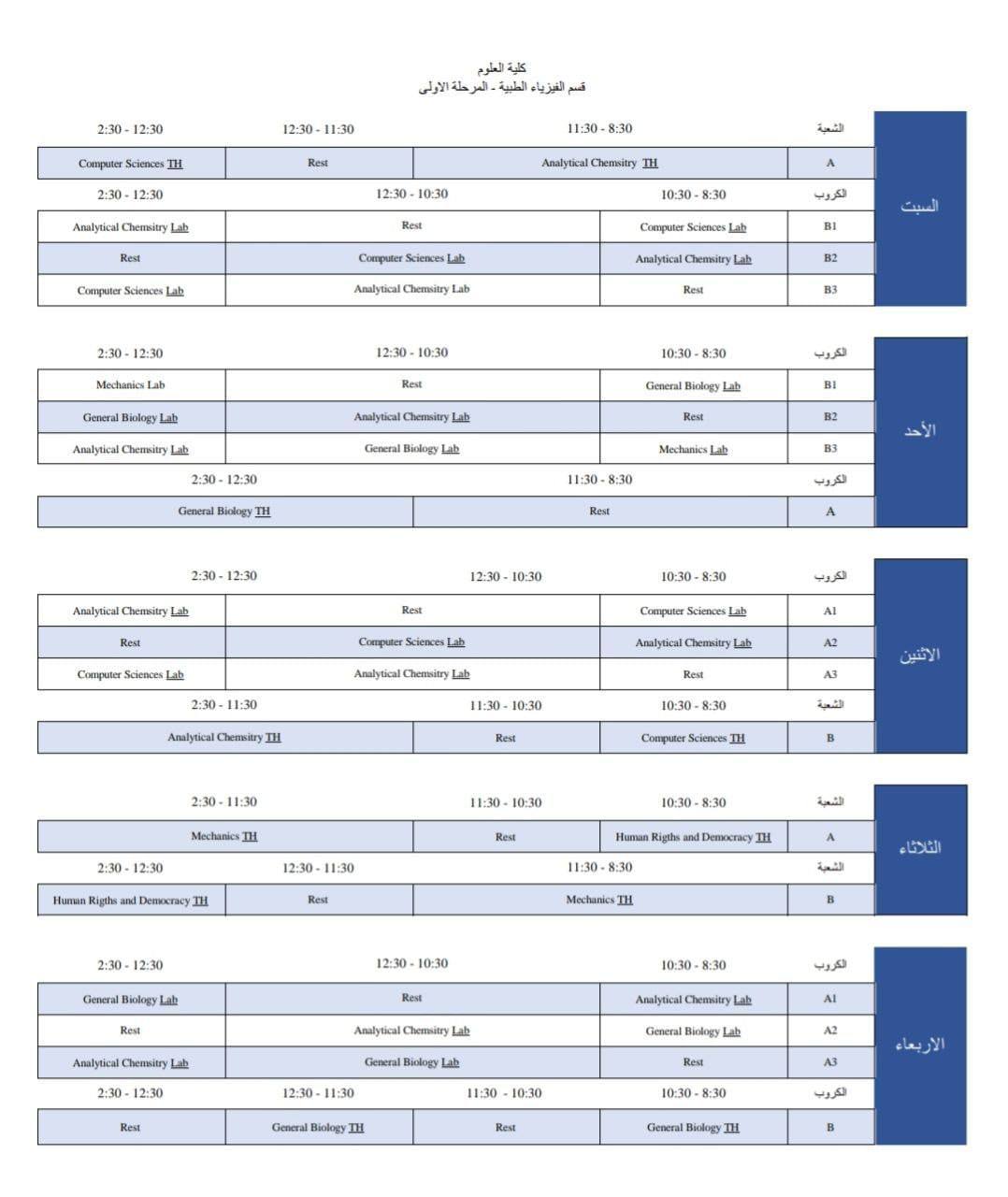 الجدول الأسبوعي لطلبة المرحلة الأولى قسم الفيزياء الطبية