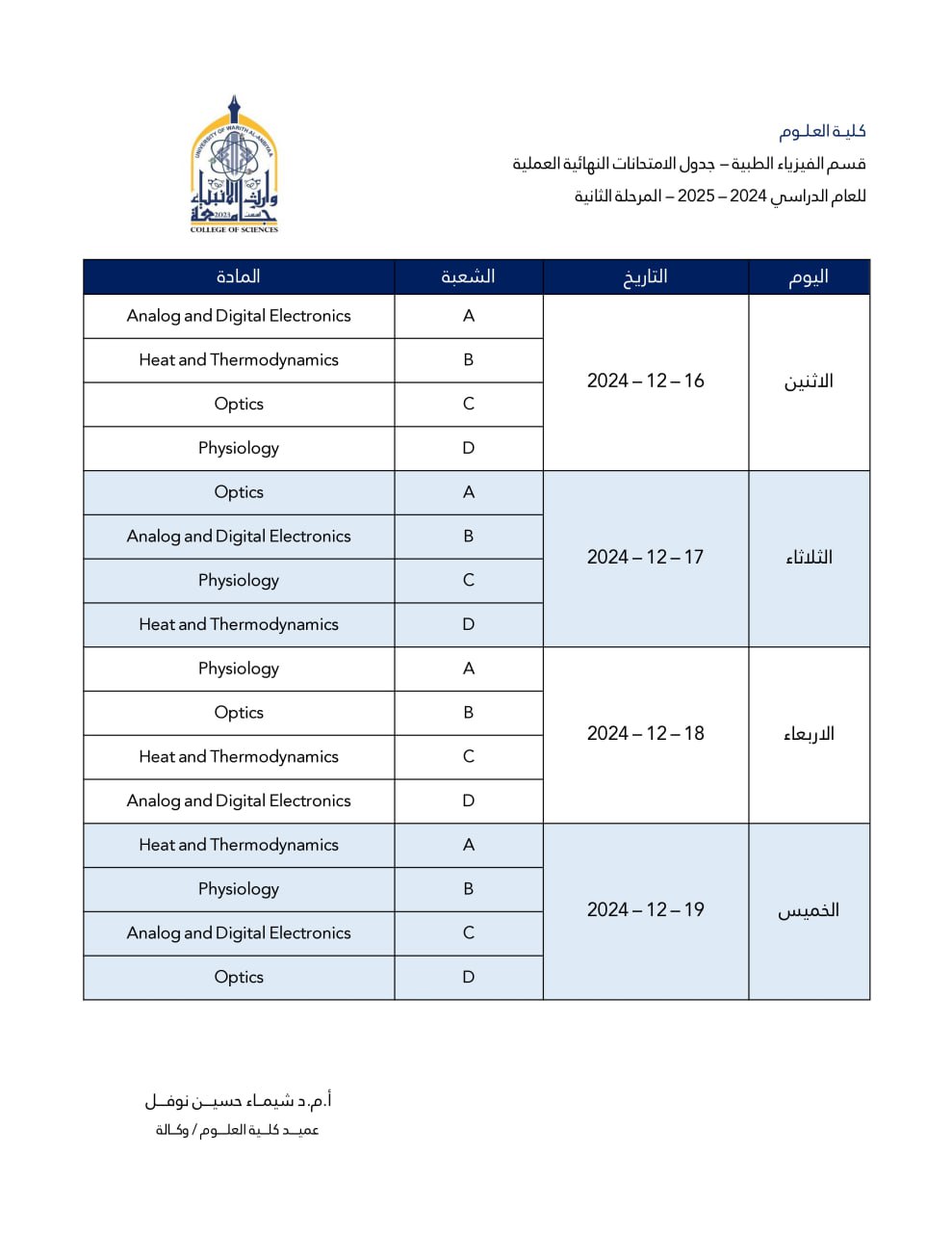 الجدول النهائي للامتحان العملي النهائي لقسم الفيزياء الطبية