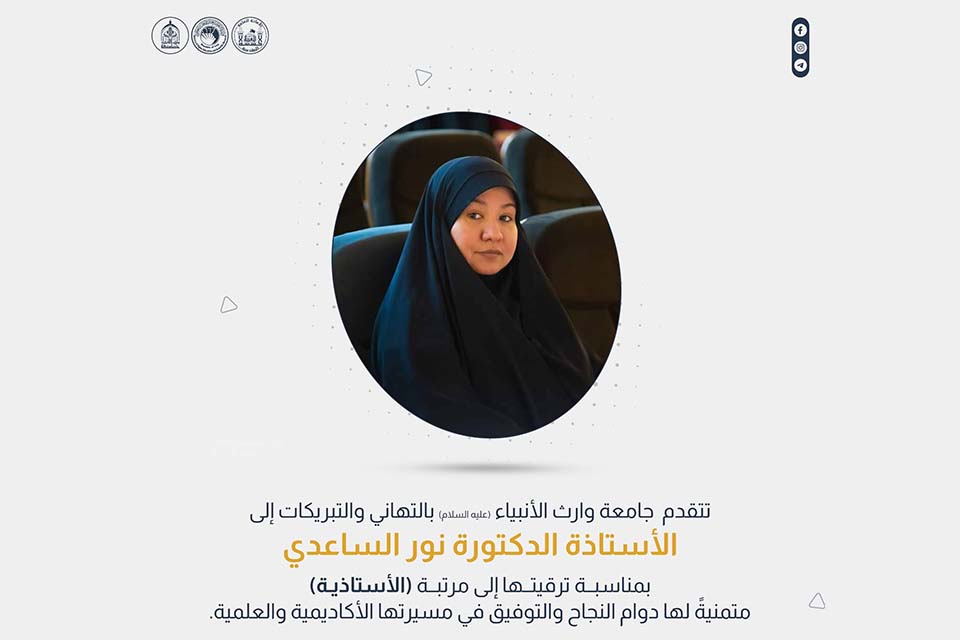 تقدمت جامعة وارث الأنبياء (عليه السلام) بأسمى التهاني والتبريكات إلى الأستاذة الدكتورة نور الساعدي، التدريسية في كلية العلوم الإسلامية، بمناسبة ترقيتها إلى مرتبة (الأستاذية). وتمنت الجامعة لها دوام النجاح والتوفيق في مسيرتها الأكاديمية والعلمية، مؤكدةً على فخرها بإنجازاتها المتميزة.