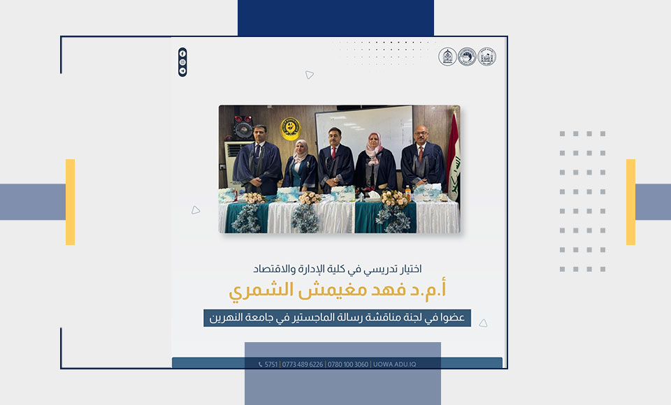 تم اختيار الأستاذ المساعد الدكتور فهد مغيمش الشمري، معاون عميد كلية الإدارة والاقتصاد بجامعة وارث الأنبياء (عليه السلام)، عضواً في لجنة مناقشة رسالة ماجستير لأحد طلبة الدراسات العليا في قسم اقتصاديات إدارة المصارف بكلية اقتصاديات الأعمال في جامعة النهرين.
