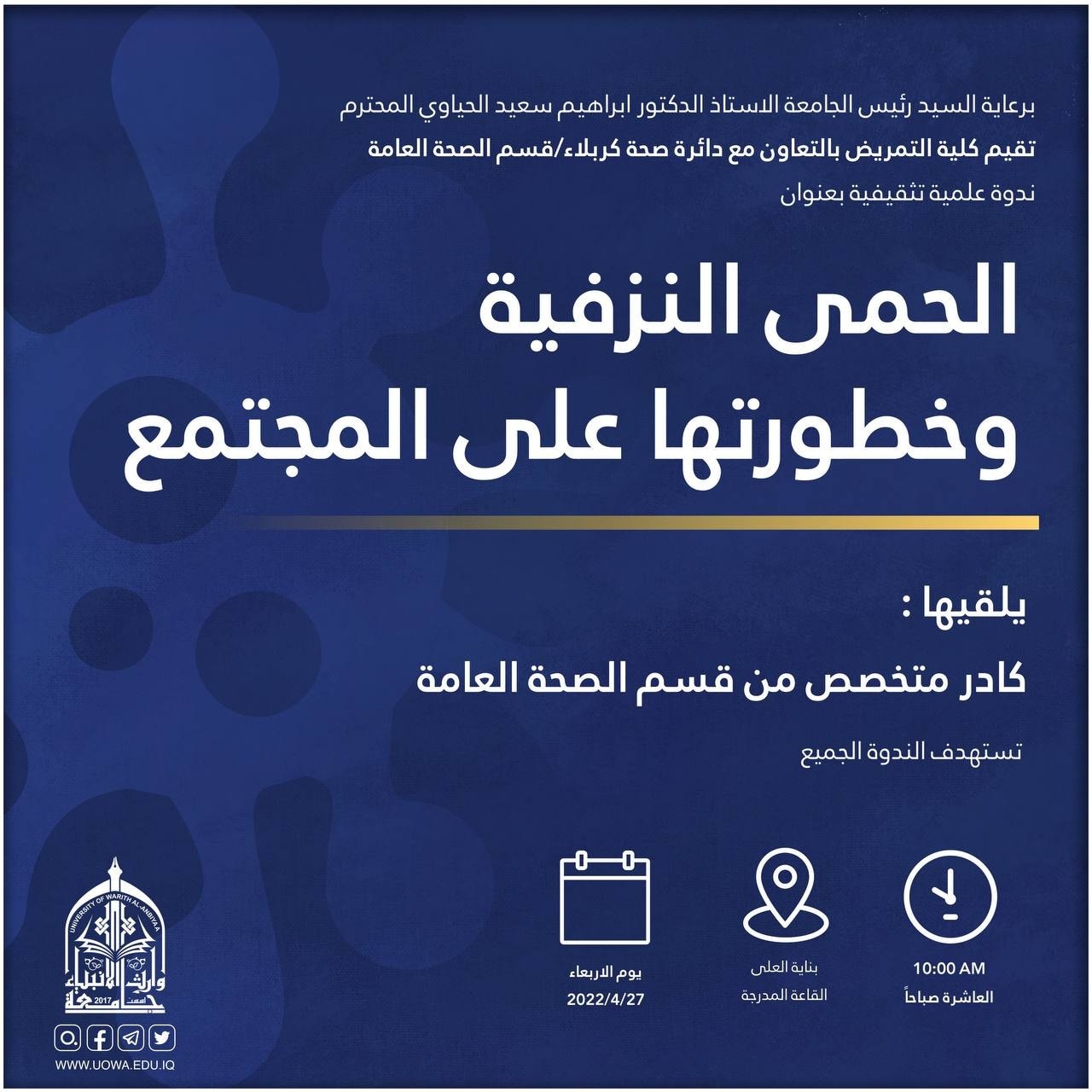 أقامت كلية التمريض ندوة علمية بعنوان (الحمى النزفية وخطورتها على المجتمع)القاها المدرس المساعد اسماعيل محمد السعديوتطرق السعدي خلال الندوة الى التعريف بمرض الحمى النزفية الذي بات يصنف من الامراض الفايروسية الخطيرة والتي تصل نسبة وفيات المصابين به الى 40%.