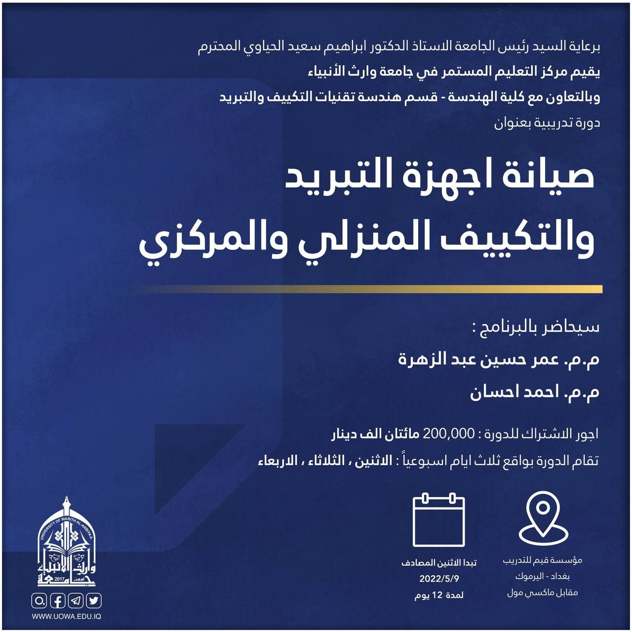 برعاية رئيس الجامعة الاستاذ الدكتور ابراهيم الحياوي يقيم مركز التعليم المستمر وبالتعاون مع كلية الهندسة/ قسم هندسة تقنيات التكييف والتبريد دورة تدريبية بعنوان