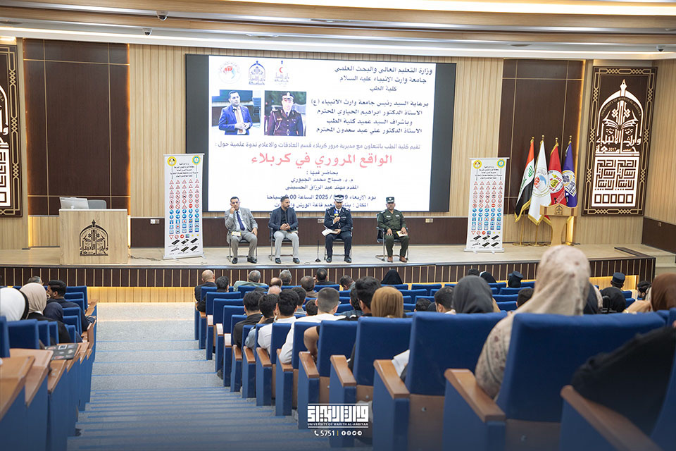 في إطار سعيها المستمر لتعزيز الوعي المروري وتحقيق السلامة العامة، نظمت كلية الطب في جامعة وارث الأنبياء (عليه السلام) بالتعاون مع مديرية مرور كربلاء المقدسة ندوة علمية بعنوان "الواقع المروري في محافظة كربلاء المقدسة"، وذلك بحضور عدد من الأساتذة والباحثين والمتخصصين في مجال المرور.