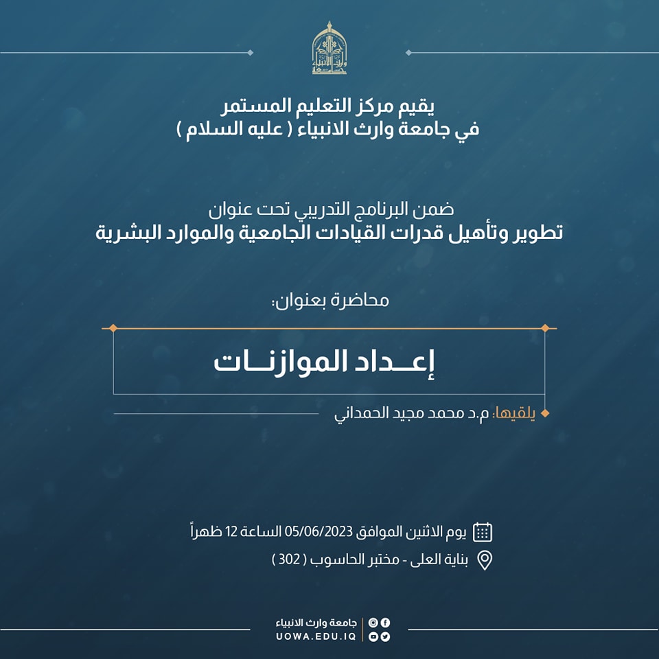 يقيم مركز التعليم المستمر في جامعة وارث الأنبياء (عليه السلام)، ضمن البرنامج التدريبي تحت عنوان " تطوير وتأهيل قدرات القيادات الجامعية والموارد البشرية