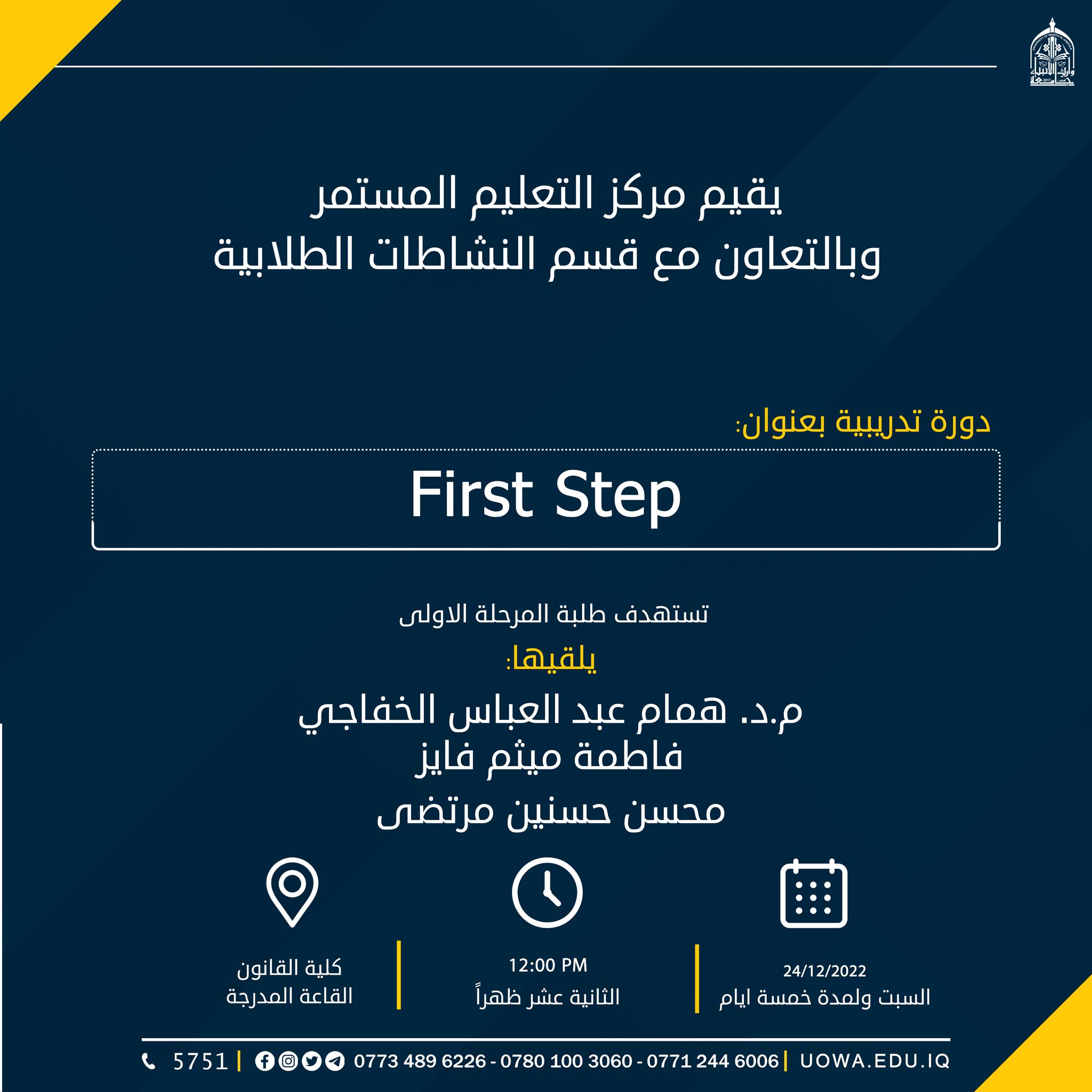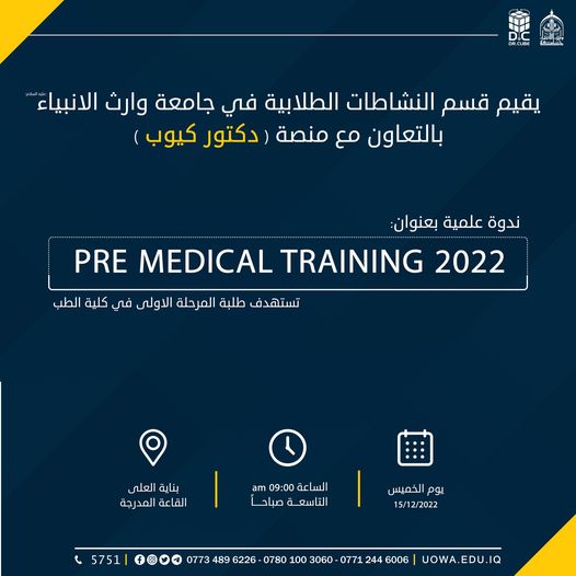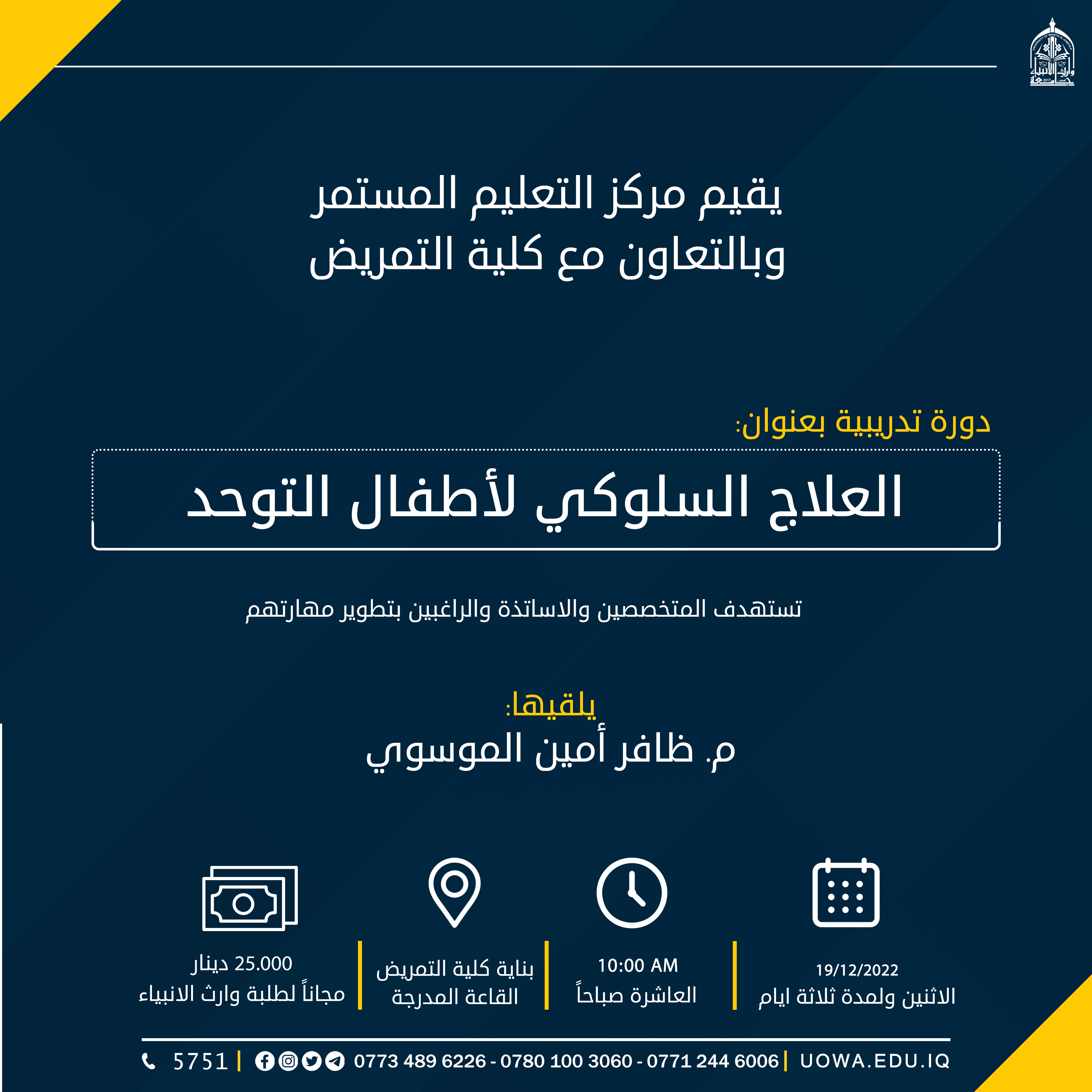 تحت رعاية السيد رئيس جامعة وارث الانبياء (عليه السلام) الاستاذ الدكتور ابراهيم الحياويوبأشراف السيد عميد كلية التمريض أ.م.د. مرتضى غانم عداي الجبورييقيم مركز التعليم المستمر في جامعة وارث الانبياء وبالتعاون مع كلية التمريض
