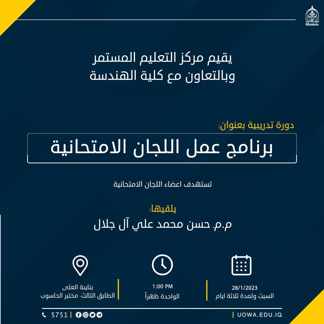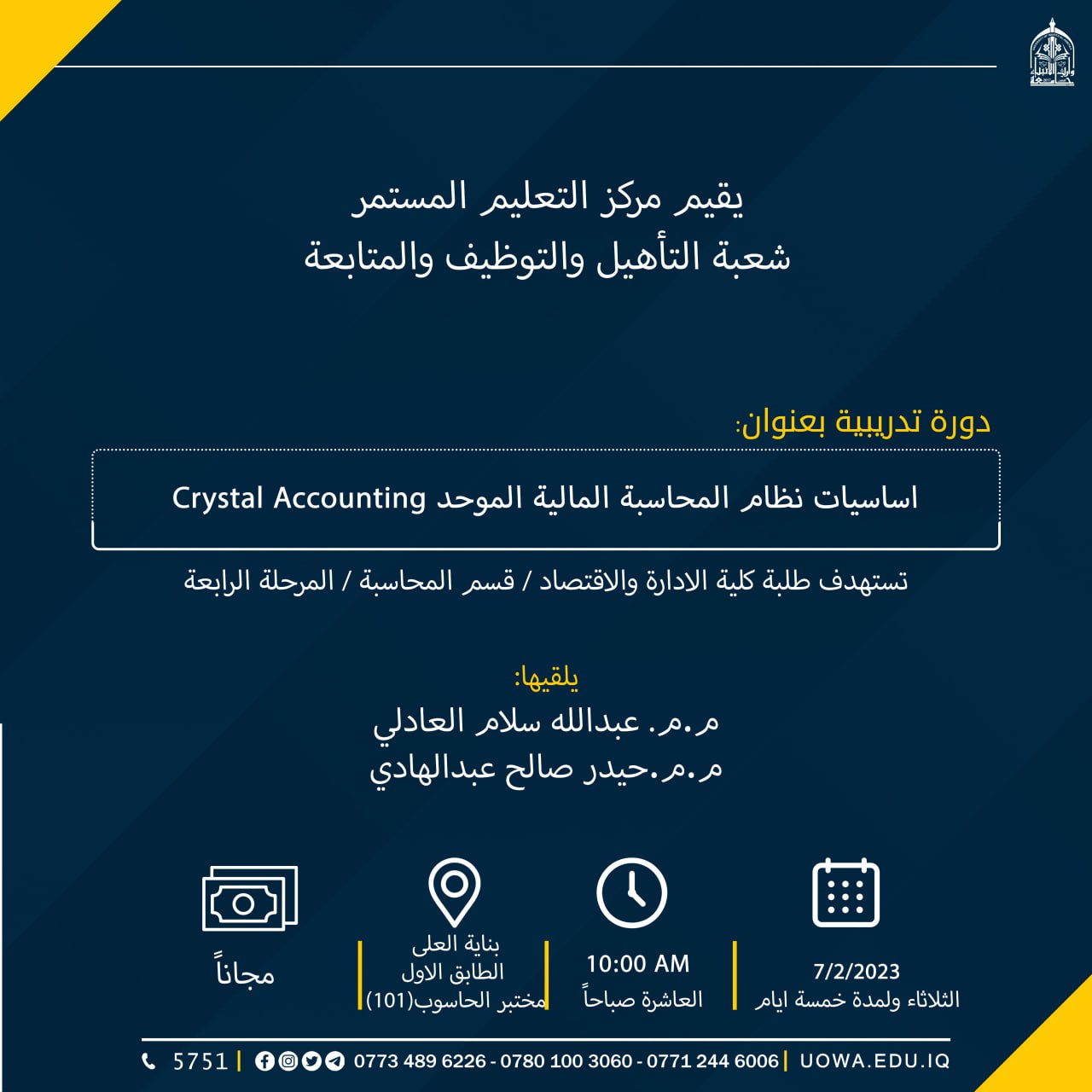 سعياً للإستفادة من العطلة الربيعية وتزويد الطلبة المقبلين على التخرج بالمهارات التي تمكنهم من الانخراط في سوق العمل، أقام مركز التعليم المستمر/ شعبة التأهيل والتوظيف والمتابعة دورة تدريبية لطلبة المرحلة الرابعة في كلية الادارة والاقتصاد بعنوان "اساسيات نظام المحاسبة الموحد " استمرت لمدة خمسة ايام، قدمها كل من م.م عبدالله سلام العادلي وم.م حيدر صالح عبد الهادي.