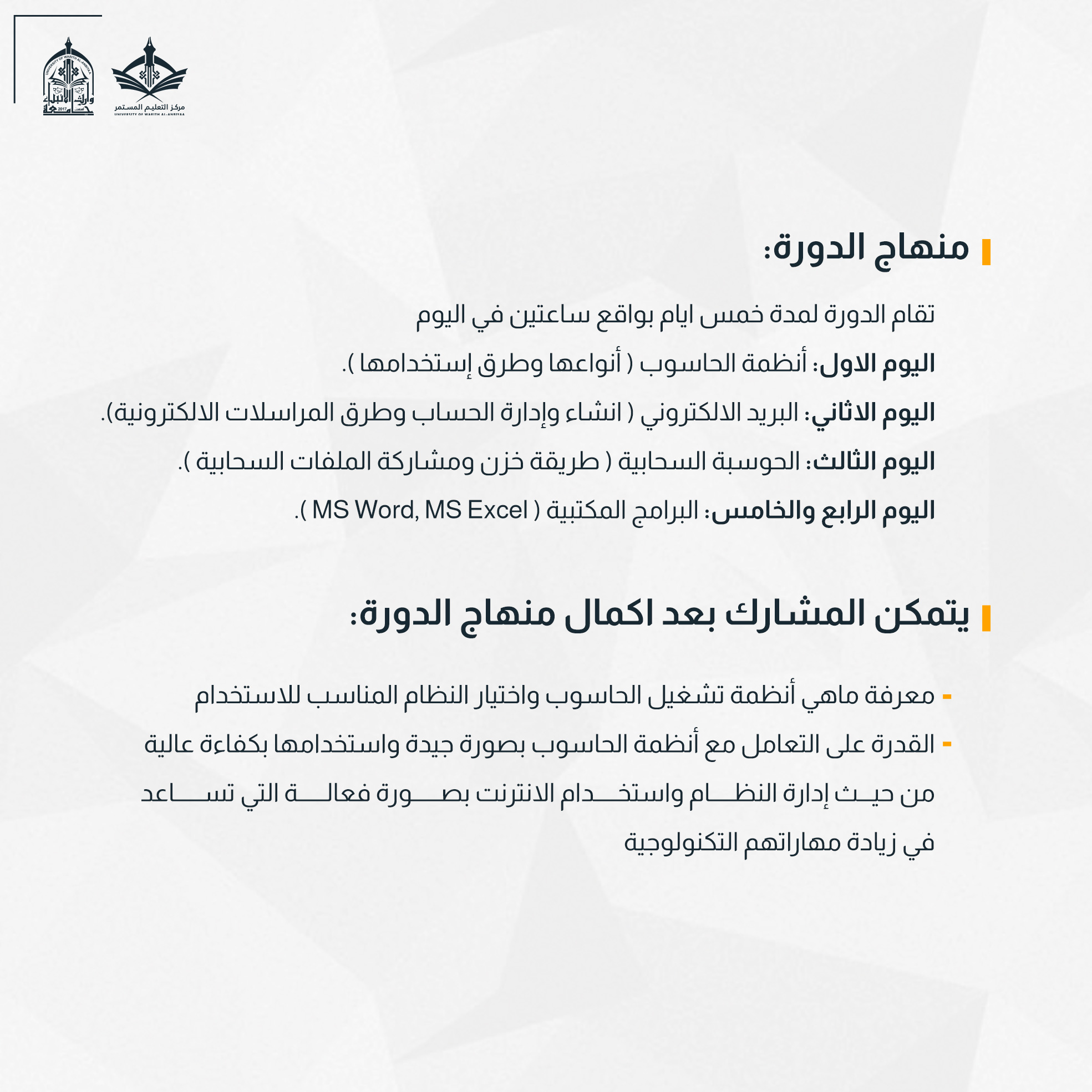 أقام مركز التعليم المستمر في جامعة وارث الانبياء(عليه السلام) دورة تدريبية لطلبة الجامعة بعنوان "مهارات الحاسوب" تستمر لمدة خمسة أيام .