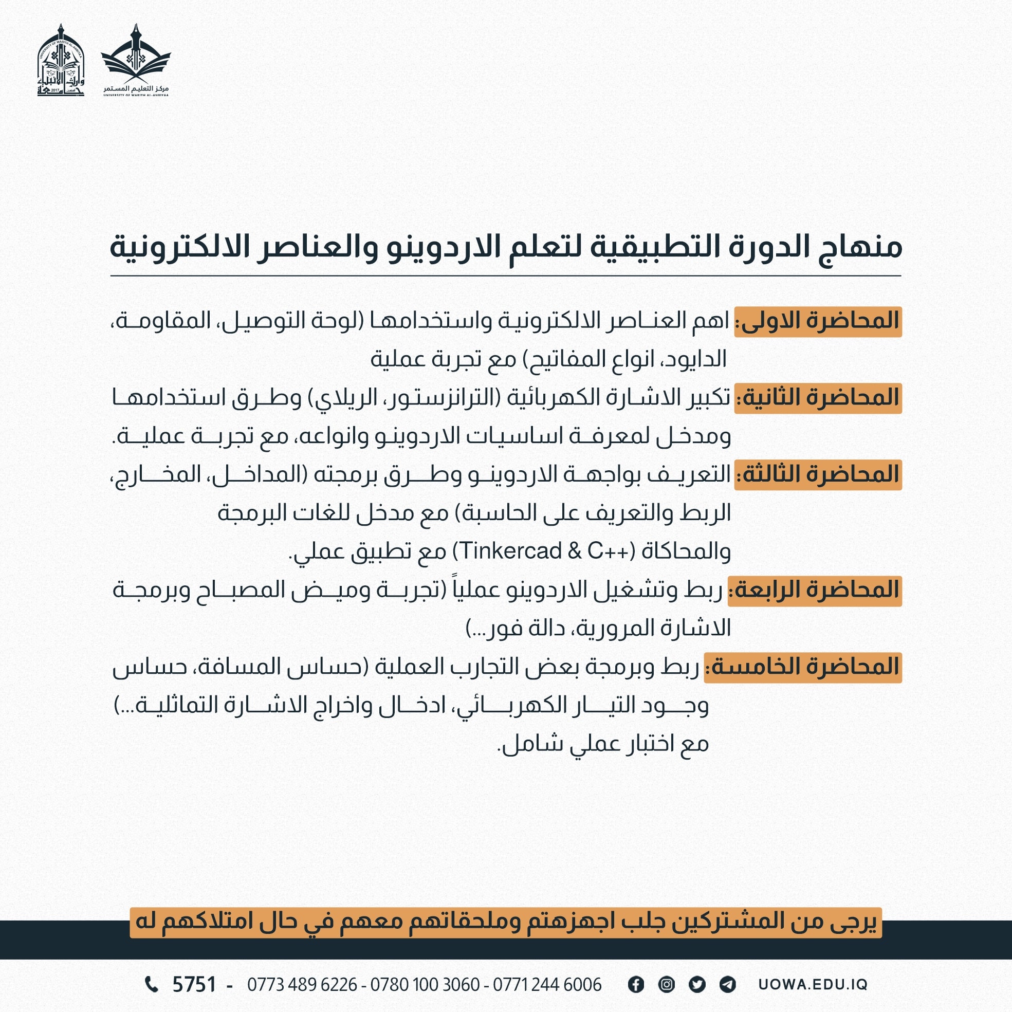 اجور الدورة25000 الف دينار عراقي للمشترك الواحد (يتم تسهديدها في قسم الشؤون المالية في جامعة وارث الانبياء).مجاناً لطلبة جامعة وارث الانبياء.