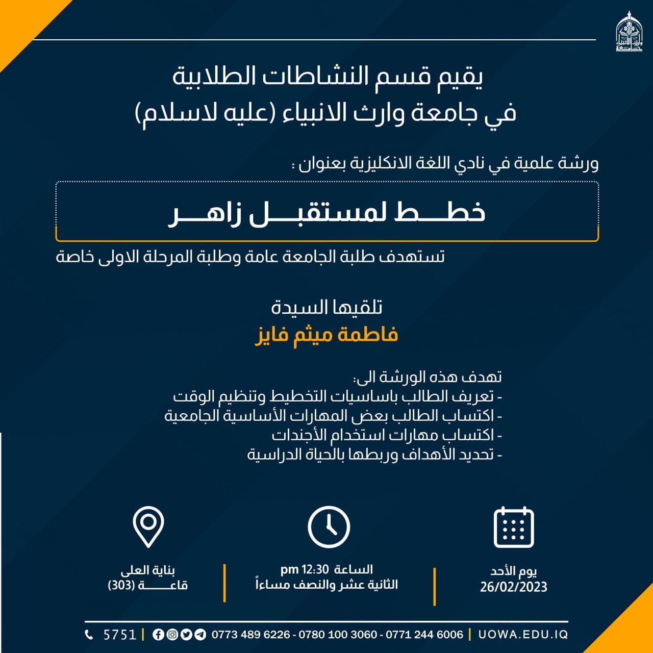 العراق – كربلاء المقدسة على قاعات جامعة وارث الانبياء ع.الوقت