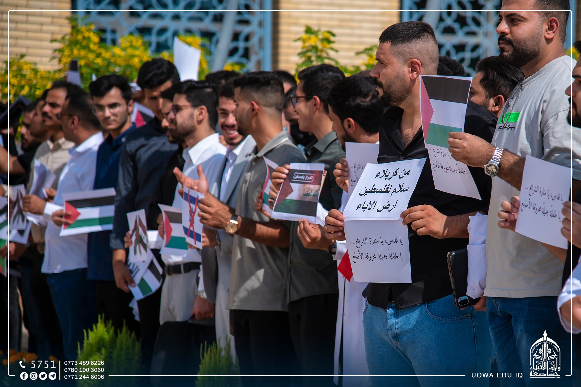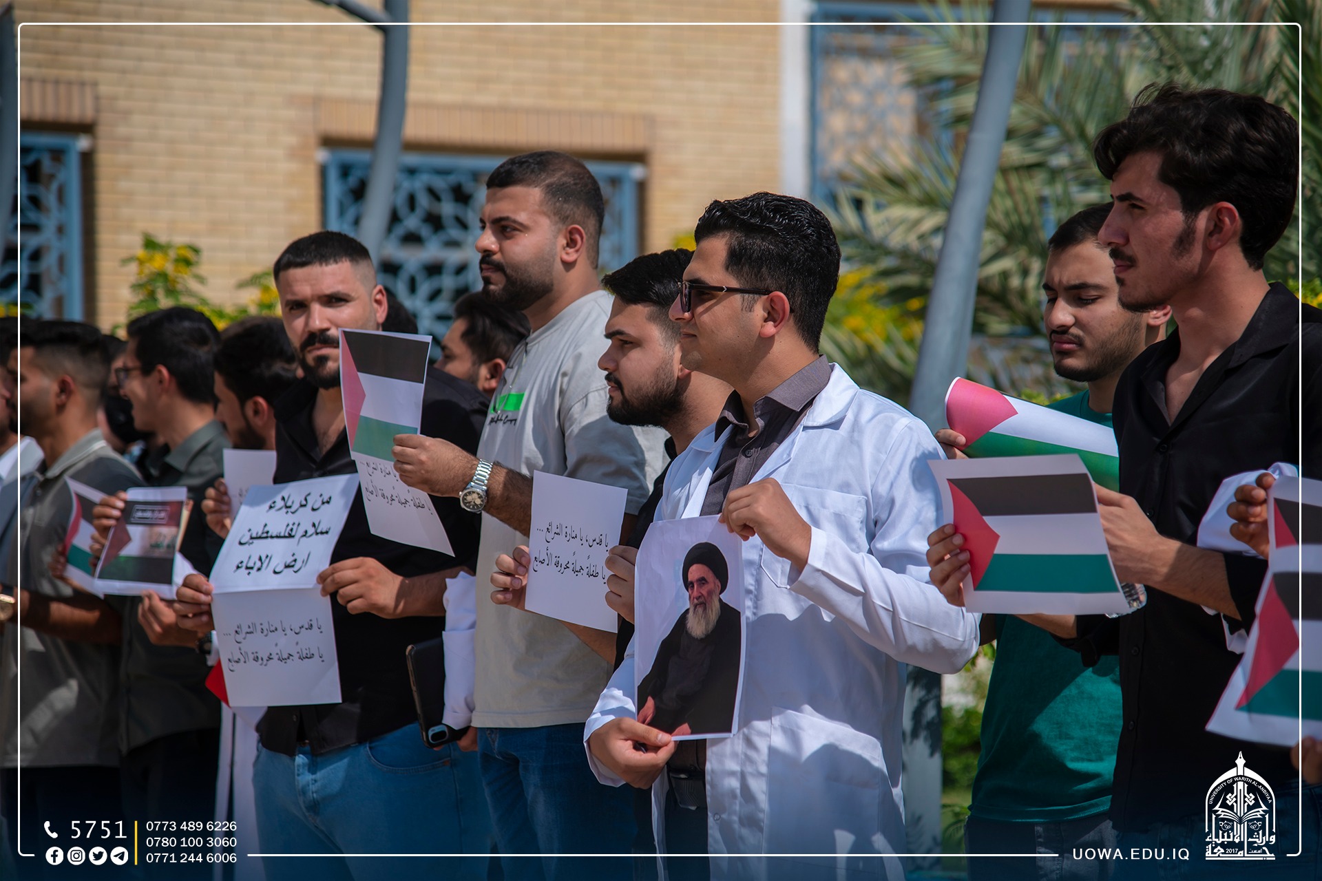 The University of Warith Al-Anbiyaa (peace be upon him) organizes a solidarity stand with the Palestinian people and reaffirms its support for the brave Palestinian people in their resistance against the occupiers. The whole world is called upon to stand against this terrible brutality and prevent the Israeli forces from executing their plans to cause more harm to the oppressed Palestinian people. All of this is happening in full view and hearing of the entire world, with no deterrent or hindrance. There are even those who support these criminal acts under the pretext of self-defense. We ask Allah to assist them and grant them victory, for victory comes only from Allah, the Mighty, the Wise.