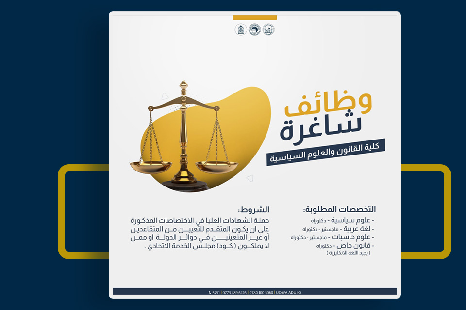 The University of Warith Al-Anbiyaa (PBUH), the College of Law and Political Science, announces its need for job positions in order to fulfil its long-term goals and bolster its teaching staff.