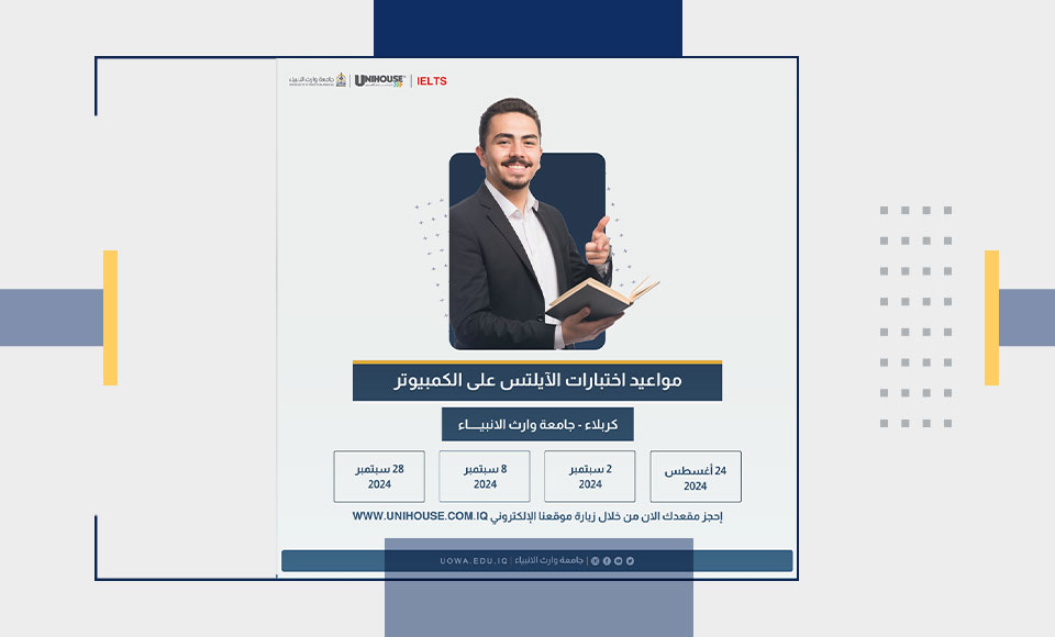 The University of Warith Al-Anbiyaa (PBUH) announces the availability of the British IELTS exam via computers, with the feature of retaking one skill in cooperation with the accredited Unihouse organisation for international IELTS tests.