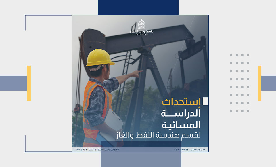 The Department of Oil and Gas Engineering at the College of Engineering at the University of Warith Al-Anbiyaa (PBUH) has announced the launch of an evening study plan. The purpose of this new addition is to give students who want to pursue studies in this important sector more educational alternatives.