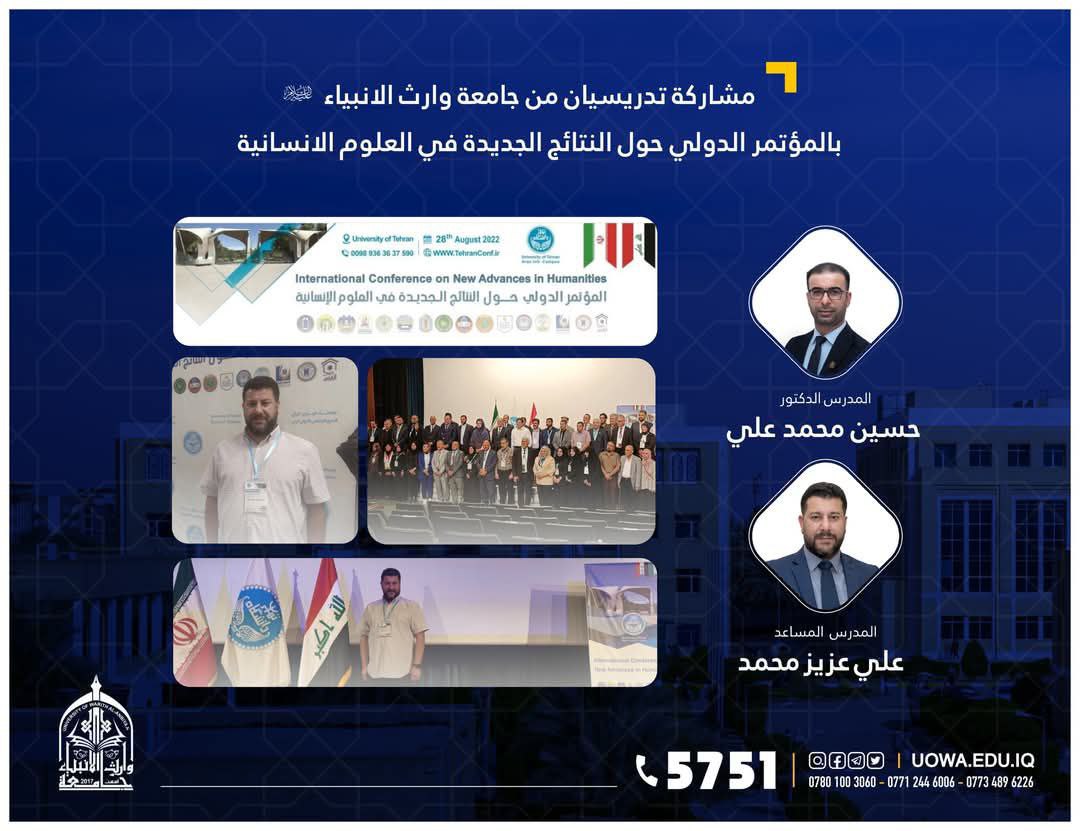 The two faculty members from the College of Administration and Economics / Department of Business Administration, Dr. Hussein Muhammad Ali and M.A. Ali Aziz Al-Kalkawi, participated in the "International Conference on New Results in Humanities" organized by the University of Tehran, with wide participation from several Arab and international countries.