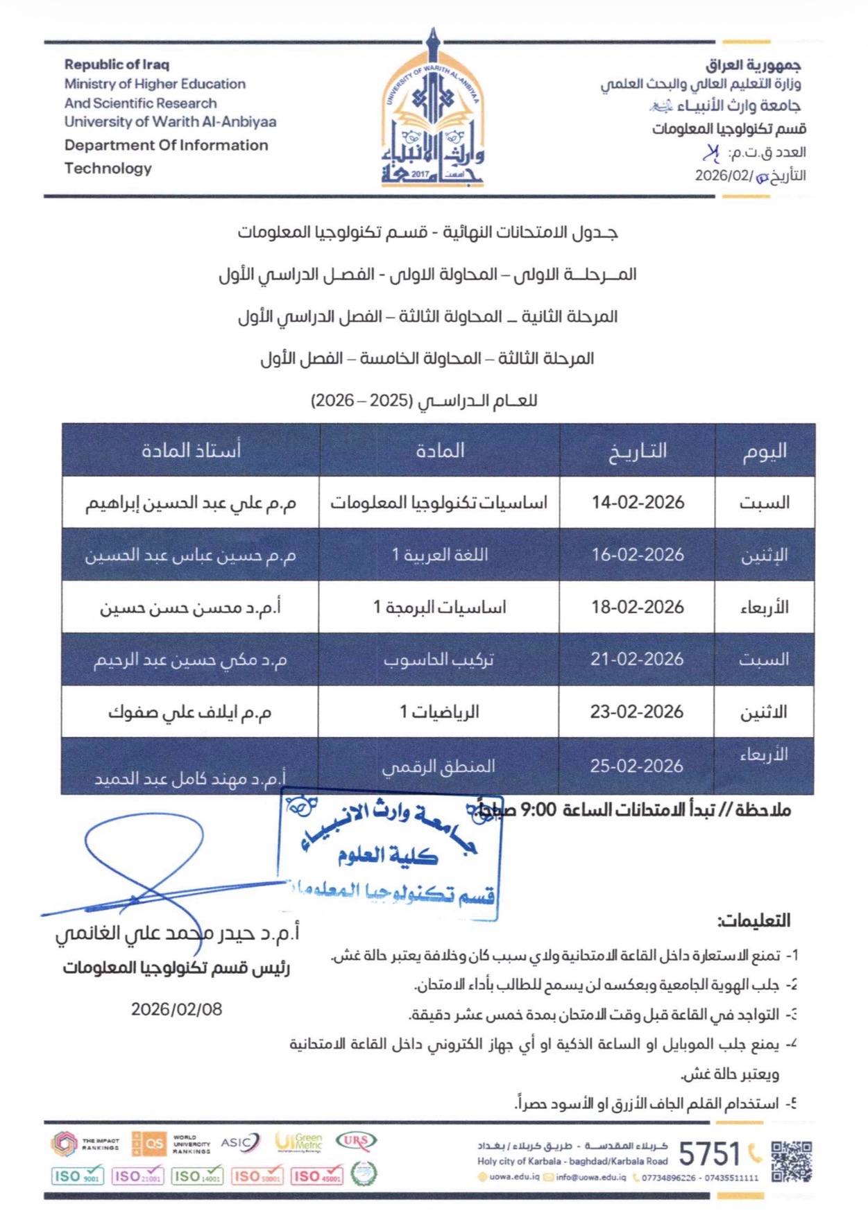 Final Examination Schedule / First Stage – First Attempt – First Semester 2025–2026