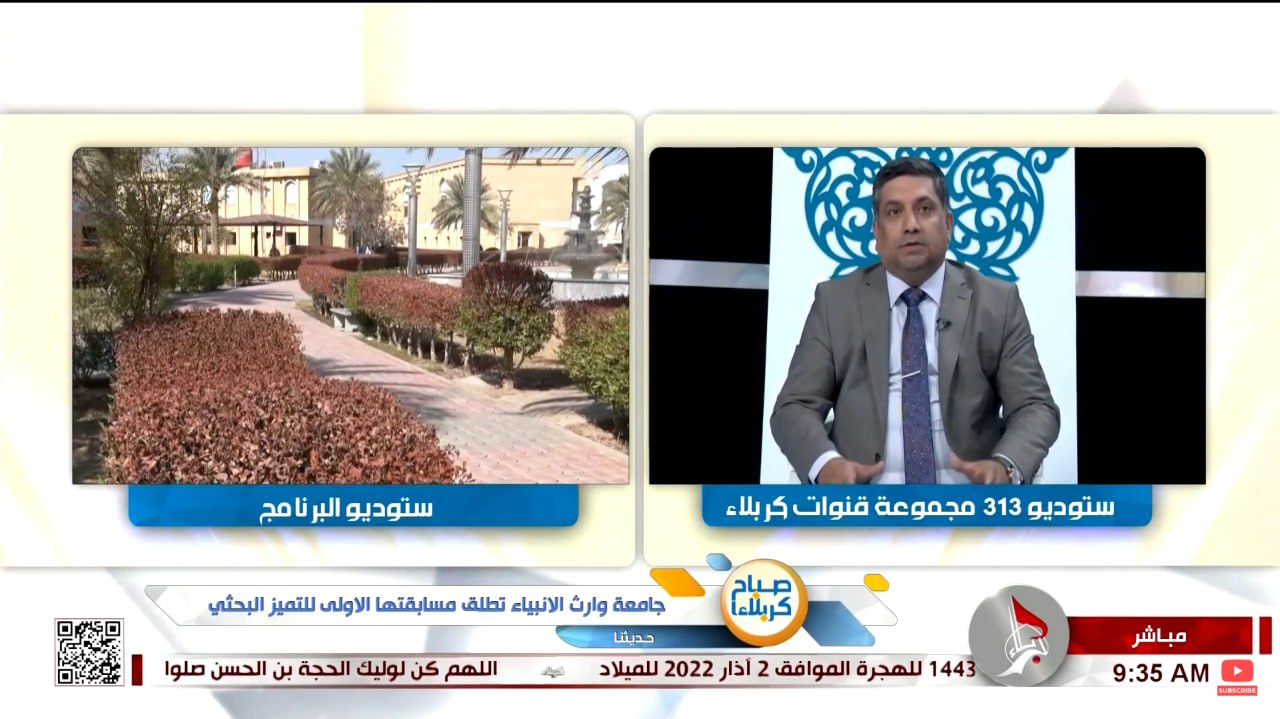 Karbala Channel hosted the Dean of the College of Engineering, Assistant Professor Dr. Hussein Hadi Al-Awadi, on the Karbala Morning Program to talk about the Warith University Research Excellence Competition and the conditions for solid scientific research. The doctor spoke about the sobriety of scientific research, as well as the sobriety of the university and educational institutions.It depends on the infrastructure, laboratories, and the practical aspect. Sober scientific research has been approved for faculty members as part of the sobriety of the educational institution. From this principle, the presidency of the University of Heir al-Anbiya took the initiative, under the auspices of the Ministry of Higher Education and Scientific Research, as well as under the direct supervision of the institutional body. Represented by the Holy Hussein ShrineHe explained that the objectives of the competition are to encourage researchers to conduct scientific research and publish in reputable scientific journals, as well as to follow up with researchers on the latest scientific developments in all fields. The competition was in three main axes: the medical axis, the engineering axis, and the science axis. There were cash prizes for the three winners. There are also prizes and certificates of appreciation for the top ten winners