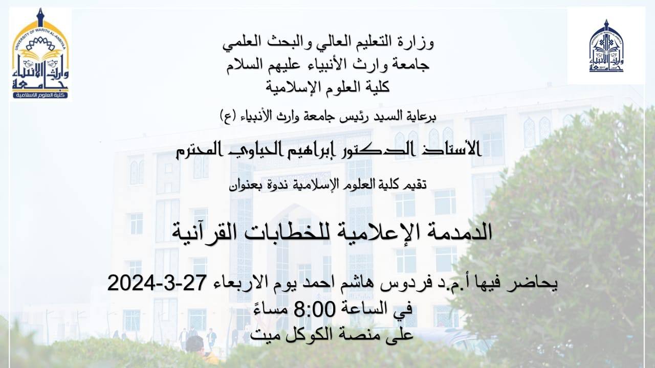The College of Islamic Sciences at the University of Heir al-Anbiya, peace be upon them, held a scientific symposium entitled “Media Rumble of Quranic Discourses,” where the symposium was presented and analyzed by Prof. Firdous Hashem Ahmed, on Wednesday, March 27, 2024, at eight o’clock in the evening, on the Google Meet platform.