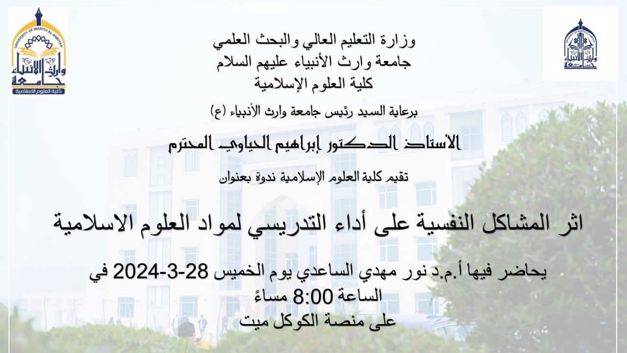 An important scientific symposium was held at the College of Islamic Sciences at the University of Heir al-Anbiya, peace be upon them, under the title “The Impact of Psychological Problems on the Teaching Performance of Islamic Sciences Subjects.” This symposium was presented by A.M.D. Nour Mahdi Al-Saadi, on Thursday, March 28, 2024 at eight o’clock in the evening on the Google Meet platform.