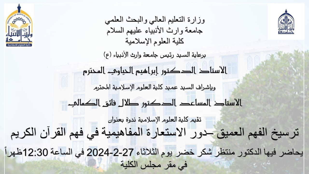 With the guidance and support of the President of the University of Warith Al-Anbia, Professor Ibrahim Al-Hayawi, and under the supervision of the Dean of the College of Islamic Sciences, Assistant Professor Dr. Talal Faeq Al-Kamali, the College of Islamic Sciences at the University of Warith Al-Anbia organized a scientific workshop entitled: "Consolidating Deep Understanding - The Role of Conceptual Metaphor in Understanding the Holy Quran".